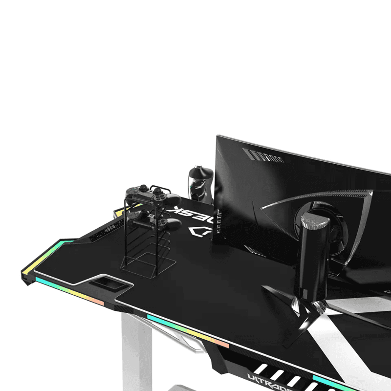 Ultradesk Gaming miza FORCE SNOW - bela, 166x70 cm, 66-86 cm, 5 nivojev višine, z XXL podlogo za miško, RGB osvetlitev, držalo za pijačo in slušalke