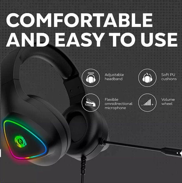 Mehke in nežne blazinice iz PU ter nastavljiv naglavni trak s kovinsko ploščico zagotavljajo popolno prileganje. Prilagodljiv vsesmerni mikrofon z gosjim vratom zagotavlja širok nabor možnosti nastavitve, tako da lahko najdete idealen položaj za jasno komunikacijo s soigralci. Posebno kolesce za uravnavanje glasnosti omogoča enostavno upravljanje zvoka.