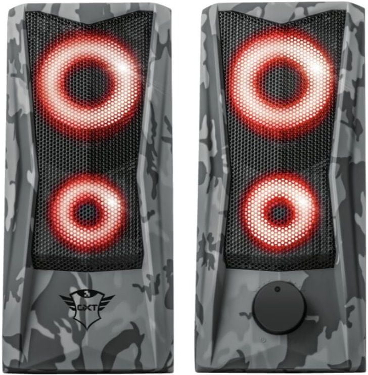 Komplet stereo zvočnikov znamke Trust se ponaša s privlačnim kamuflažnim dizajnom ter jasnim in čistim zvokom z največjo močjo 12 W. Posebna lastnost je RGB osvetlitev, ki vam popestri poslušanje glasbe. Osvetlitev se upravlja z upravljanjem za vklop/izklop na dotik na vrhu zvočnika Z zvočniki se lahko povežete žično prek USB kabla, kompatibilni pa so z vsemi osebnimi in prenosnimi računalniki. Na sprednji strani glavnega zvočnika so enostavno dosegljivi gumb za glasnost, za dodatno zaščito pa so opremljeni s kovinsko mrežico.