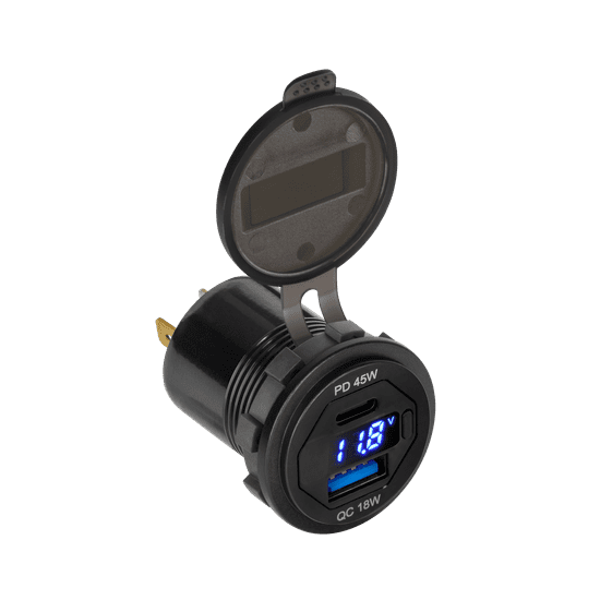 Indikator napetosti Vtičnice: USB (QC 3.0) 18W, PD 45W Vhodna napetost: 12–24V Izhodna napetost USB: 5V / 9V / 12V Izhodni tok USB: 3A / 2A / 1,5A Izhodna napetost PD: 5V/9V/12V/15V PD izhodni tok: 3A/2A/2,5A / 1,5 A Premer montažne luknje: 29 mm