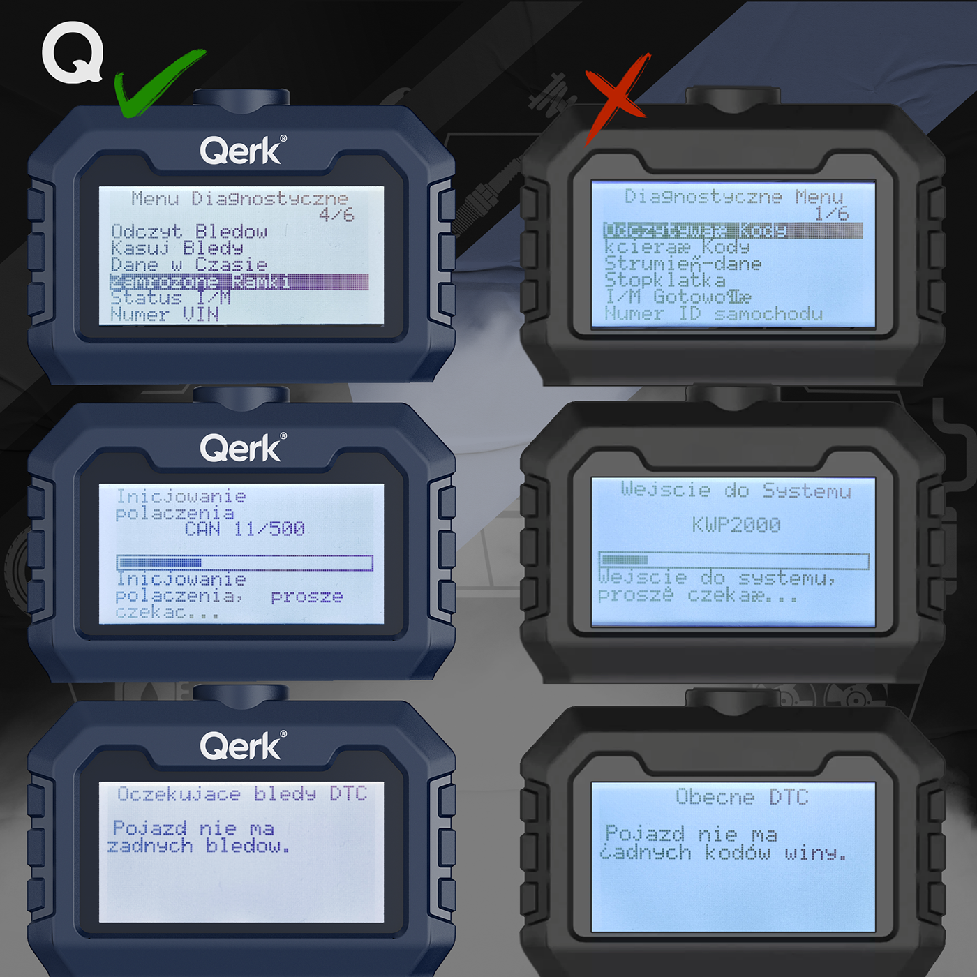 - ZAMRZNJENI OKVIRJI – odčitki nekaterih senzorjev v času napake so shranjeni z napako. Analiza podatkov zamrznjenega okvira omogoča natančno določitev okoliščin, v katerih je prišlo do napake (samo za vozila, ki podpirajo zamrznjeni okvir).
