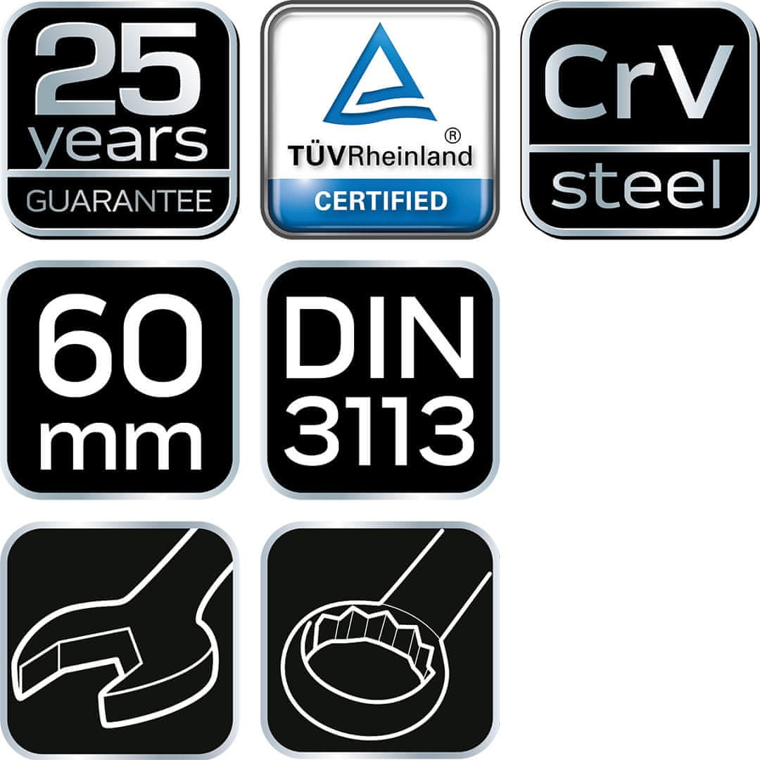 Viličasti ključ NEO (ref. št. 09–749) dimenzij 60 × 600 mm, izdelan v skladu s standardom DIN 3113. Visokokakovostno krom-vanadijevo jeklo zagotavlja dolgotrajno obstojnost ključa. Kakovost orodja potrjena s certifikatom TÜV in 25-letno garancijo proizvajalca. Blagovna znamka NEO izpolnjuje pričakovanja profesionalcev.
