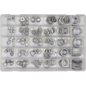 Set 300 visokokakovostnih aluminijastih podložk velikosti od 5 × 9 mm do 28 × 36 mm, skupaj 30 vrst podložk po 10 kosov.
