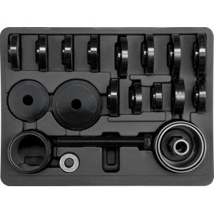 Komplet za odstranjevanje in namestitev ležajev sprednje osi ponuja različne velikosti lončkov in distančnikov. Omogoča uporabo v večini prodanih avtomobilov.