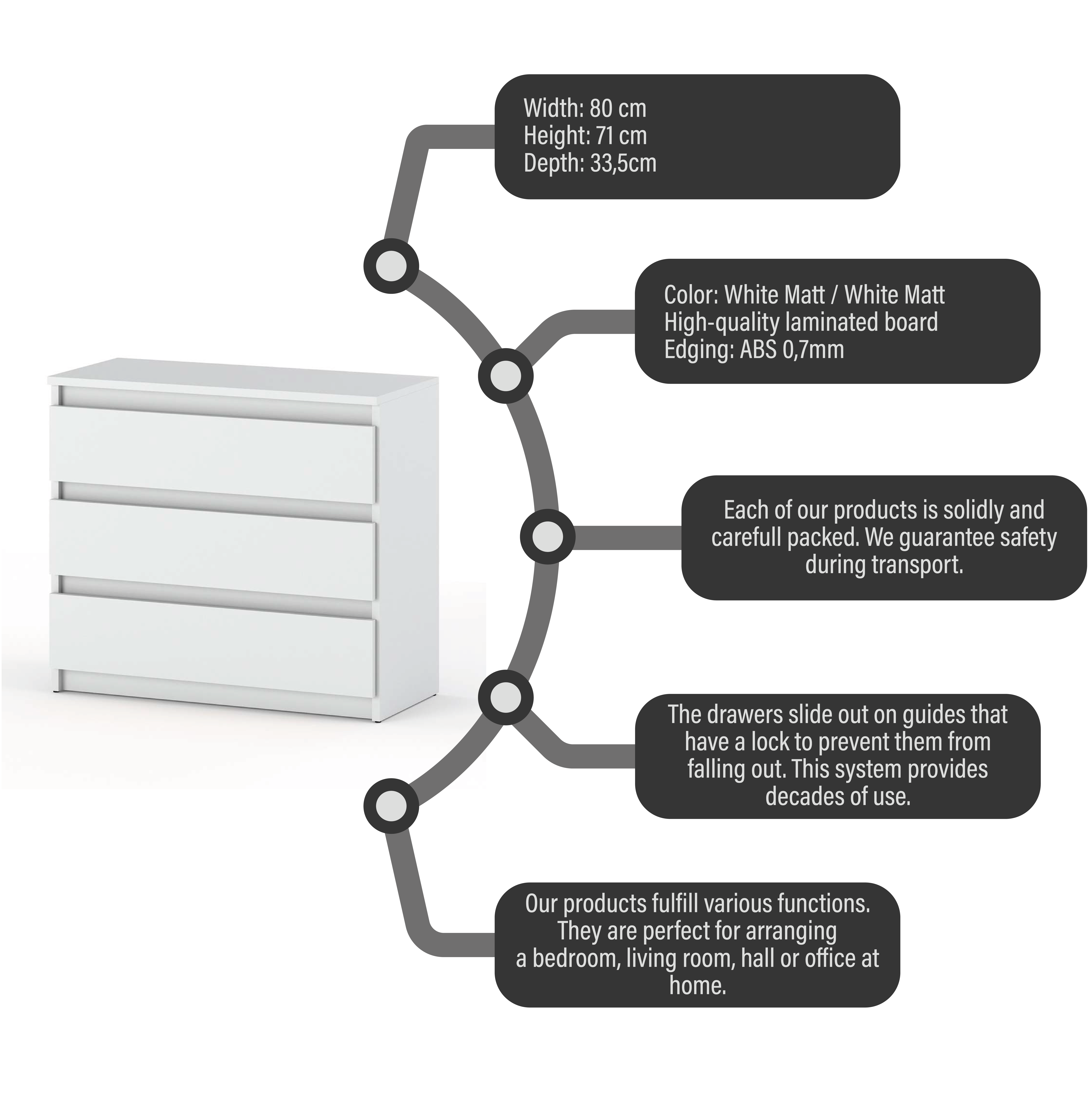 Odkrijte eleganco in funkcionalnost z našo novostjoKomoda s 3 predaliMatt White. Sodoben dizajn s frontami brez ročajev, masivno laminirano ploščo, mat površino in praktičnimi predali za optimalno organizacijo. Popoln za vsako notranjost.