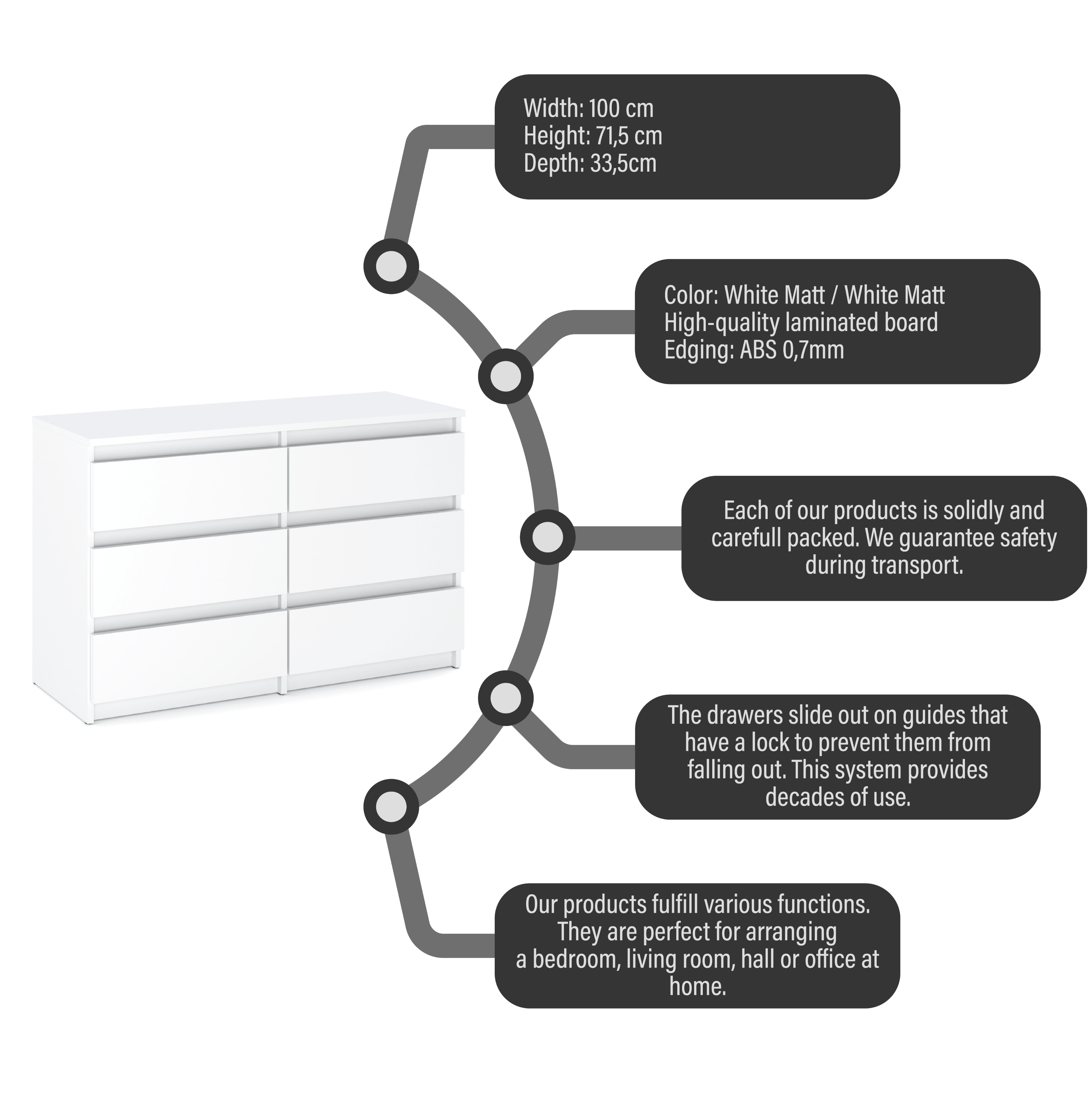 • Estetski videz:Ta mat bela komoda dodaja svežino in eleganco vsaki notranjosti ter ji daje sodoben značaj.