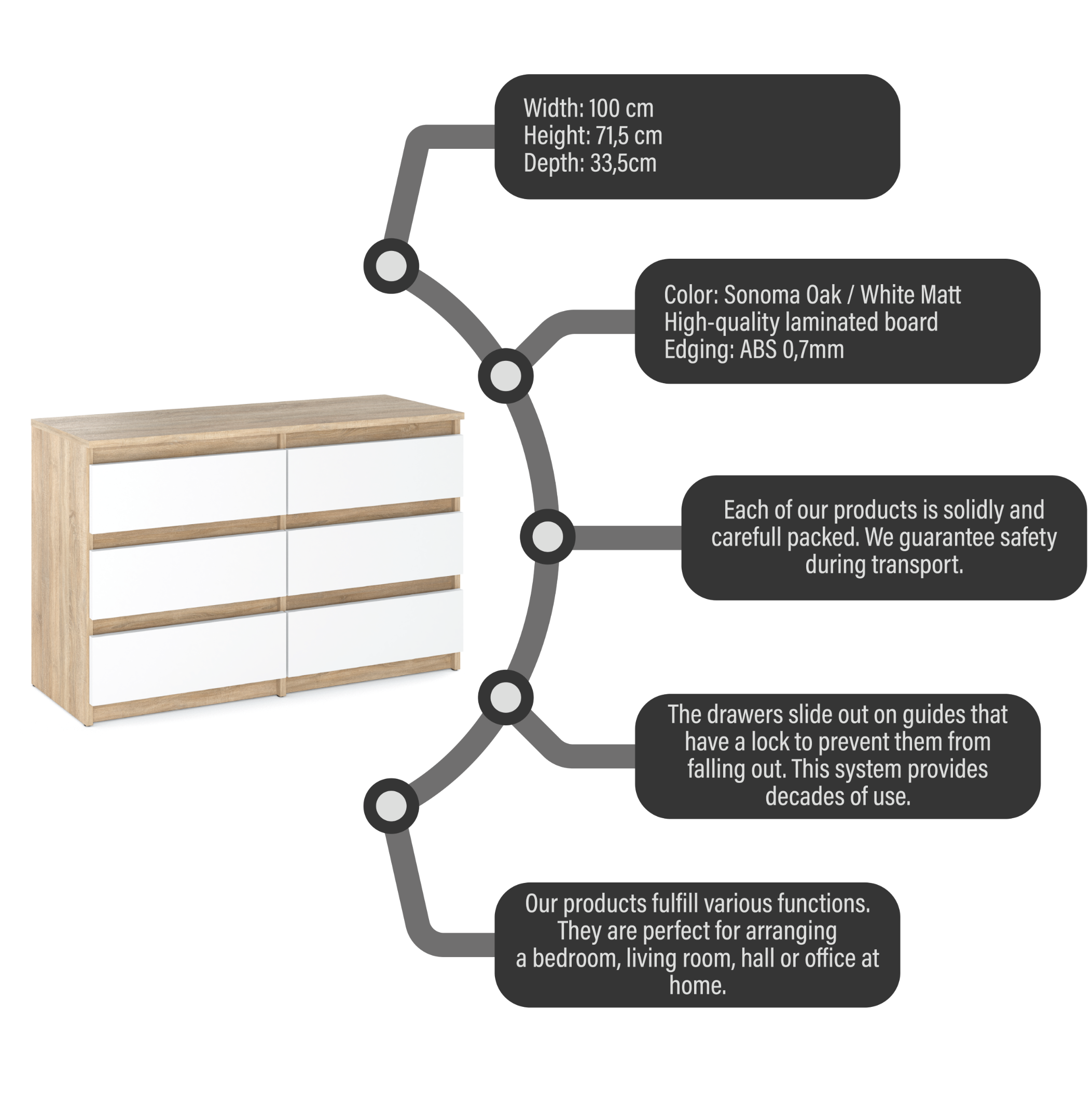 Predstavljamo elegantno in funkcionalnoKomoda Sonoma hrast mat bela s 6 predali, širina 100 cm– odlična izbira za vašo dnevno sobo, spalnico ali hodnik. Vzpostavi popolno ravnovesje med modernim dizajnom in praktičnostjo, zaradi česar je obvezen kos pohištva za vsako moderno notranjost.    ⚙️Tehnične specifikacije:Sistem pohištva: