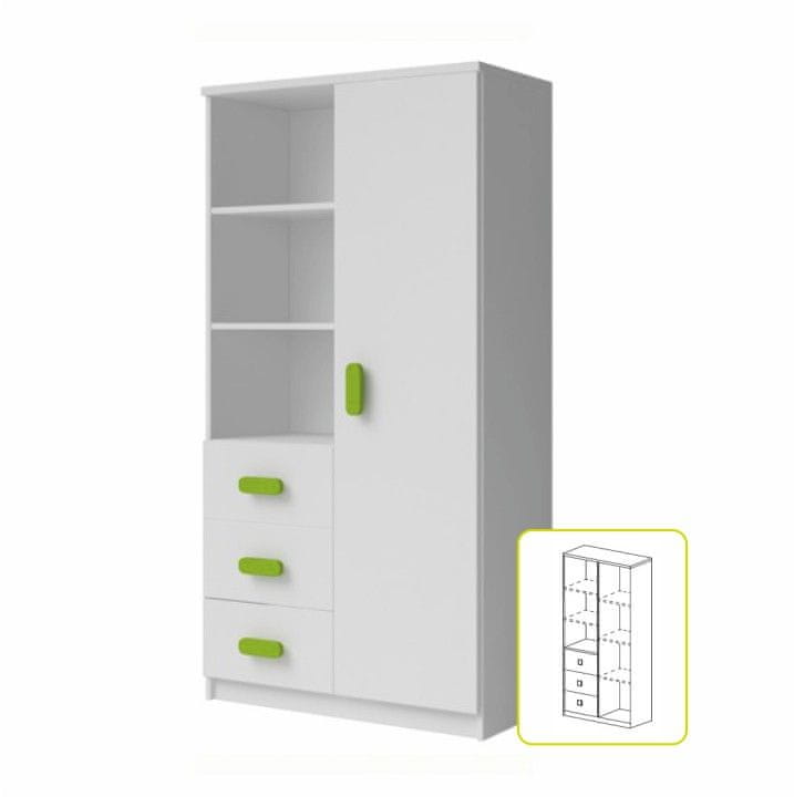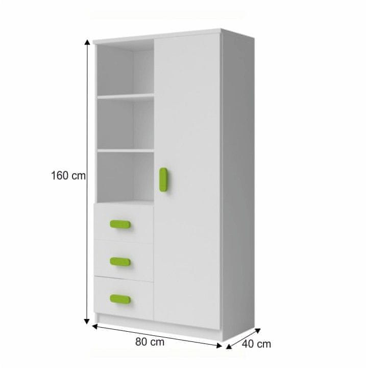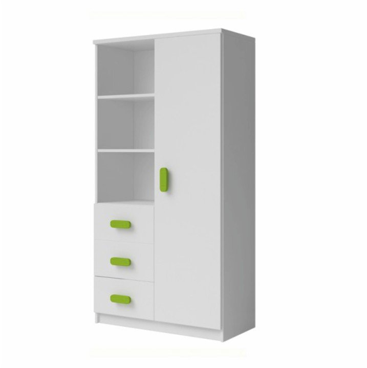 Moderna garderobna omara SVEND TIP 5 je enovratna garderobna omara s policami in tremi predali, ki jo je možno kombinirati z ostalimi elementi iz modelske serije Svend. Sistem Svend je sektorski komplet, ki je primeren za postavitev v otroško ali študentsko sobo. Sestava je izdelana iz laminiranega DTD bele barve, ročaji, ki se dokupijo, pa so na izbiro v naslednjih barvah: rdeča, zelena, oranžna. Robovi so obrobljeni z ABS obdelavo. V kompletu je možno kupiti originalne komplete okrasnih nalepk z motivi: formula, nogomet, mornar in sove.