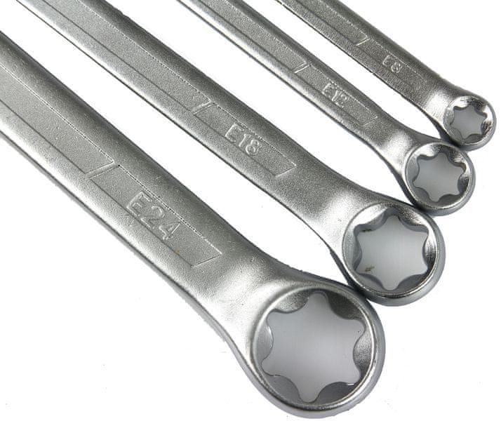 Komplet 4 nasadnih ključev velikosti 6–24 mm. Ključi so izdelani iz CrV jekla, kar zagotavlja dolgo življenjsko dobo in zanesljivost. Ključi s protizdrsno obdelavo. Zanesljivi torx nasadni ključi. Celoten opis
