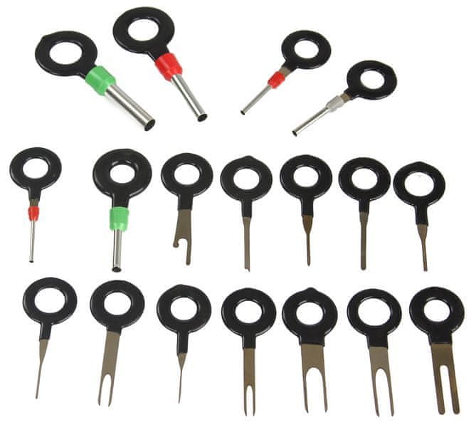 Set 18 ključev za odklop konektorjev v električnih inštalacijah je nepogrešljiv kos opreme vsakega elektronika in električarja. S kompletom lahko enostavno in hitro popravite spojne spoje brez nevarnosti, da bi jih poškodovali. Popoln komplet za večino običajno dostopnih priključkov. Ročaj je prevlečen z gumo, ki povečuje udobje pri delu, uporaben za prilagajanje in popravilo električnih sistemov v avtomobilih, motornih kolesih, čolnih itd. Dobro se obnese tudi doma za popravilo gospodinjskih aparatov in še več. Ergonomska oblika omogoča preprosto odstranjevanje zatičev, morda tudi delo na zlomljenem zatiču ali upognjeni priključni plošči ne bo poškodovalo zatičev.