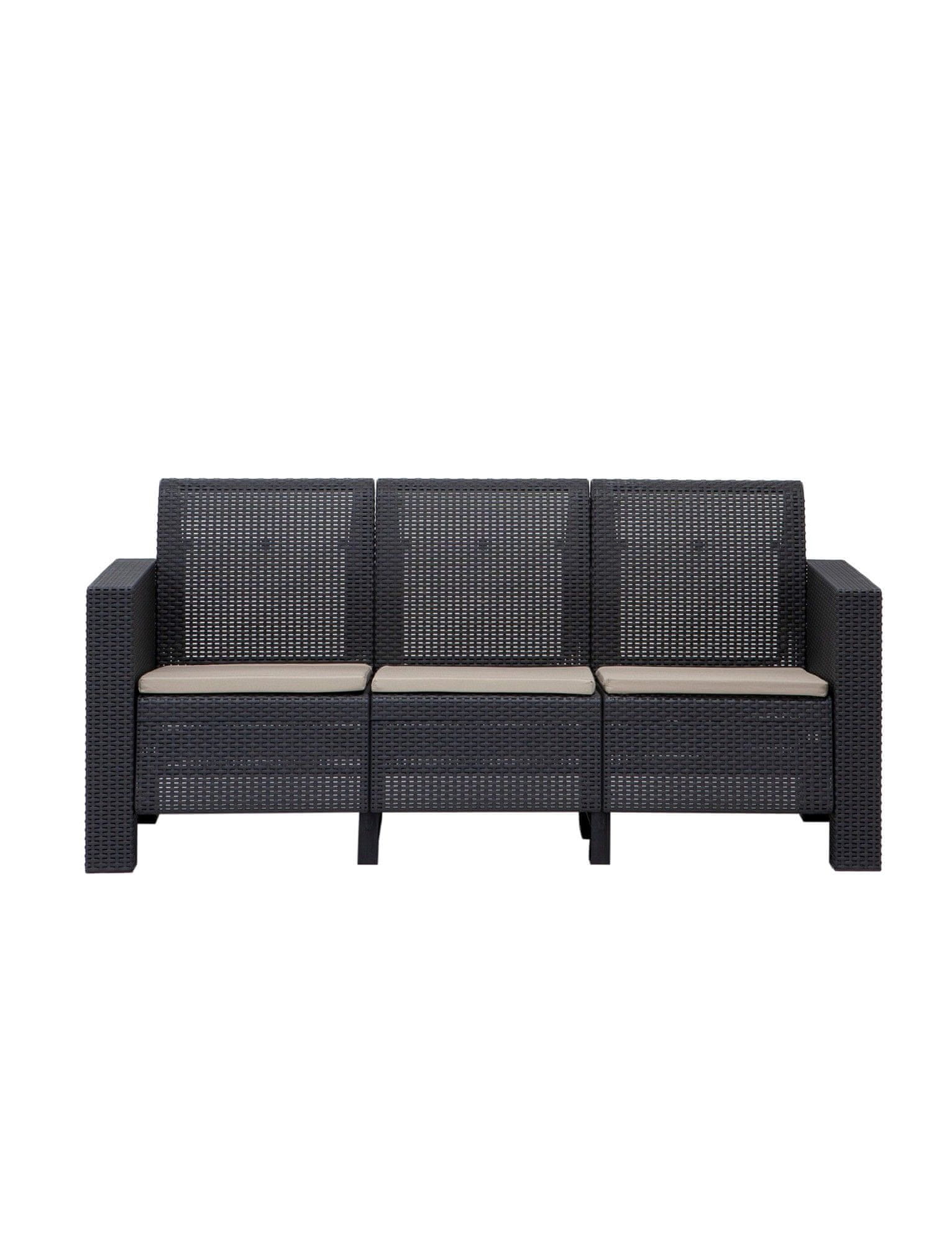 100 % POLIPROPILEN Sedežna garnitura s tremi sedeži: Širina: 183 cm Višina: 85 cm Globina: 73 cm 1-sedežna zofa: Širina: 75 cm Višina: 85 cm Globina: 73 cm Miza za kavo: Širina: 54 cm Višina: 38 cm Globina: 78 cm Število paketov: 2 77 × 88 × 69 cm / 28 kg (1 kos) 89 × 81 × 70 cm / 28 kg (1 kos)