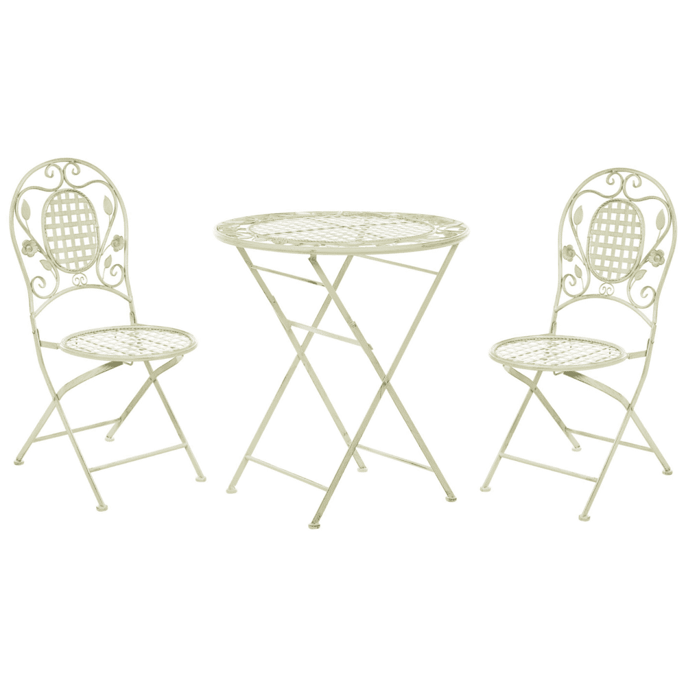 S tem elegantnim kompletom za bistro dodajte na svoj balkon ali vrt pridih provansalskega sloga. Narejen je iz prašno lakiranega železa, ima učinek poškodbe in ažurasto obliko s cvetličnimi ornamenti. Balkonski komplet vključuje dva stola in ustrezno mizo, ki je kot nalašč za zajtrk ali kosilo v dvoje na prostem. Vsak kos je zložljiv, zato ga lahko zunaj sezone preprosto shranite.
