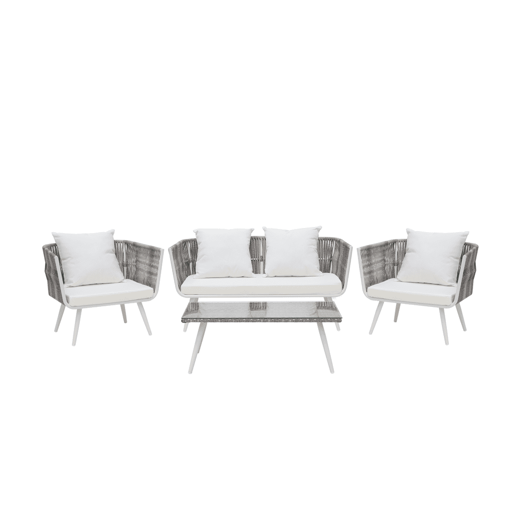 Sodobna vrtna garnitura za štiri osebe bo poskrbela za prijetno posedanje na svežem zraku na vrtu, balkonu ali terasi. Vrtno garnituro sestavljajo dva vrtna stola, dvojni vrtni kavč in vrtna miza. Pohištvo je izdelano iz ratana, mizna plošča pa iz kaljenega stekla. V kompletu so 3 sedežne blazine in 4 hrbtne blazine, ki zagotavljajo udobje pri sedenju. Vse pokrove je mogoče odstraniti.