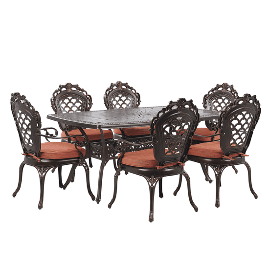 Ta vrtni set, navdihnjen s starinskim slogom, bo dodal značaj vsakemu aranžmaju. Izdelan je iz aluminija in sestavljen iz mize in šestih stolov v temno rjavem odtenku. Zaradi izrazitih vzorcev in okroglih oblik je odlična za glamur ali tradicionalne vrtove.