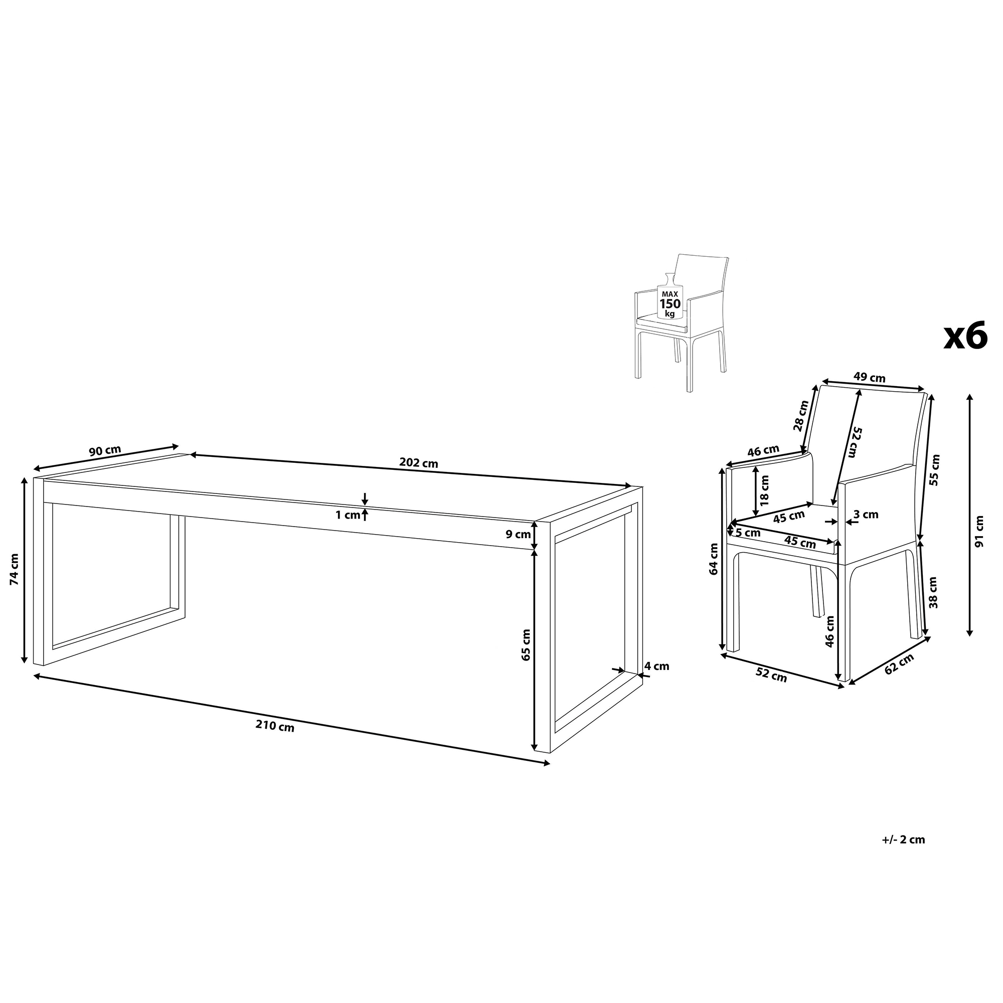 Sodobna vrtna garnitura vas vabi, da v dobrem razpoloženju preživite prijetne ure na terasi in dolgem žaru! Za to visokokakovostno vrtno pohištvo je značilna ekskluzivna zasnova z nenavadnim, a preprostim dizajnom. Šest stolov ima sedeže iz visokokakovostne in trpežne tkanine v elegantni sivi barvi ter prijetno oblazinjenje iz posebne pene s hitrim sušenjem. Tako so stoli odporni tudi na blage poletne nalive. Tekstilna površina se nahaja tudi pod steklenim vrhom velike vrtne mize. Robustna steklena plošča ponuja veliko prostora za kavo in torto, tropske sladoledne posladke ali krožnike s pisanimi solatami in klobasami na žaru.
