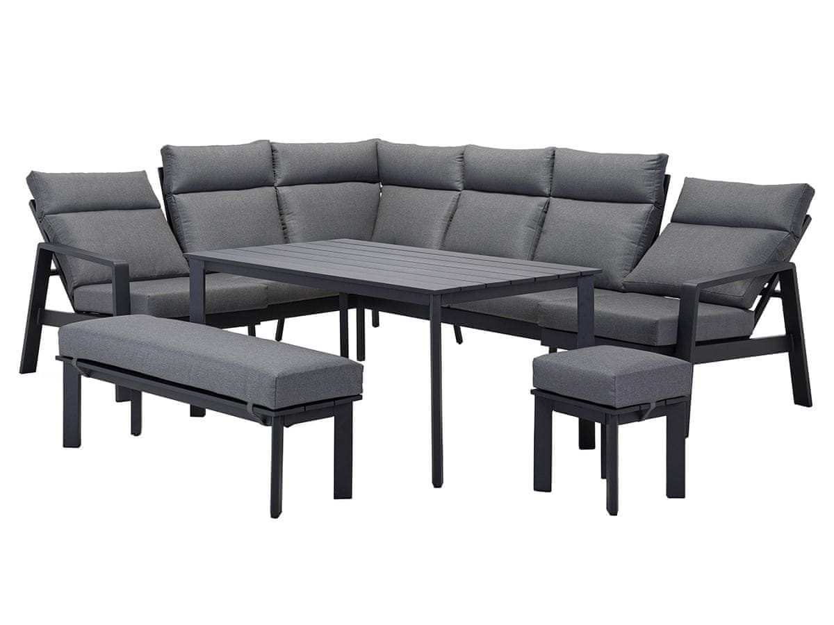 Aluminijasto vrtno pohištvo MARINITA je izjemno praktično. Z njim lahko opremite teraso, vrt ali prostoren balkon. Marinita je dovršeno moderno oblikovana in je sestavljena iz štirih kosov pohištva. Sestavljen je iz velike kotne sedežne garniture dimenzij (ŠxGxV): 280×218×93 cm, mize dimenzij (ŠxGxV): 150×87×33 cm, tabureja (ŠxGxV): 37×37×33,2 cm in klopi dimenzij (ŠxGxV): 130×37×33,2 cm. . Struktura pohištva je izdelana iz aluminija, črne barve, ki je odporen na korozijo, vremenske vplive in ga odlikuje dolga življenjska doba. Praktični nasloni za roke, ergonomski sedež, profilirana vzglavnika in dva nastavljiva sedeža na sedežni garnituri zagotavljajo maksimalno udobje in priročnost med uporabo. Mehke, temno sive blazine na sedežih in naslonjalih so izdelane iz visokokakovostnega poliestra, ki je odporen na vlago in obrabo. Ne odlašajte in si vsekakor priskrbite to vrtno pohištvo, ki vam ne bo nudilo le maksimalnega udobja ob srečanjih ali praznovanjih z družino in prijatelji, temveč se bo zaradi svojega modernega videza estetsko podalo v vsako okolje.