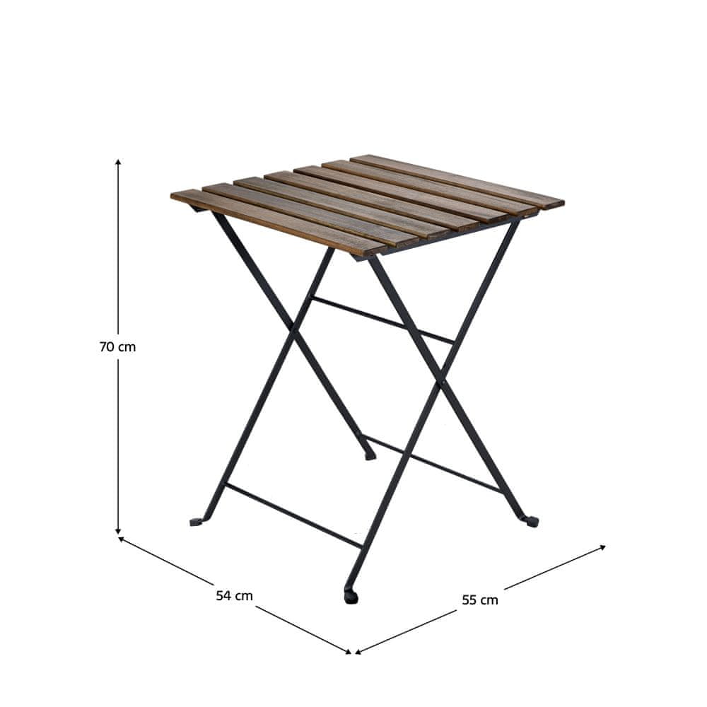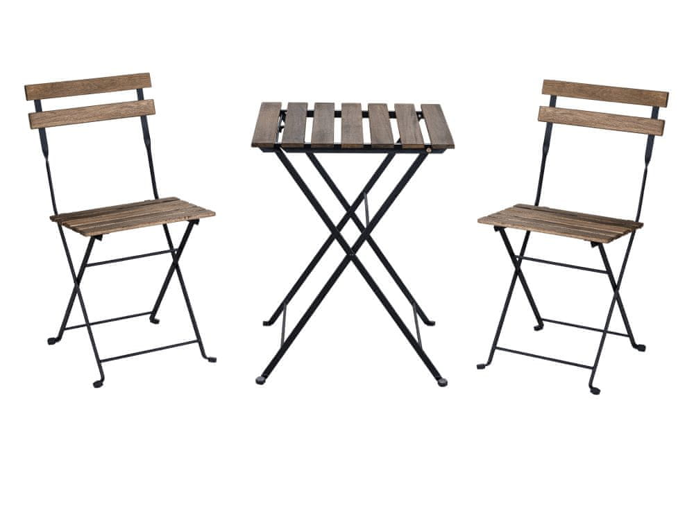 Vrtna garnitura je izdelana iz visokokakovostnega masivnega akacijevega lesa in dopolnjena s kovinskimi elementi v elegantni črni barvi. Ta kombinacija materialov ne zagotavlja le estetske vrednosti, temveč tudi dolgo življenjsko dobo in odpornost na vremenske vplive. Komplet je zasnovan tako, da nudi udobje dvema osebama, zato je idealen za romantične večere ali sproščujoče trenutke s prijatelji ali družino.