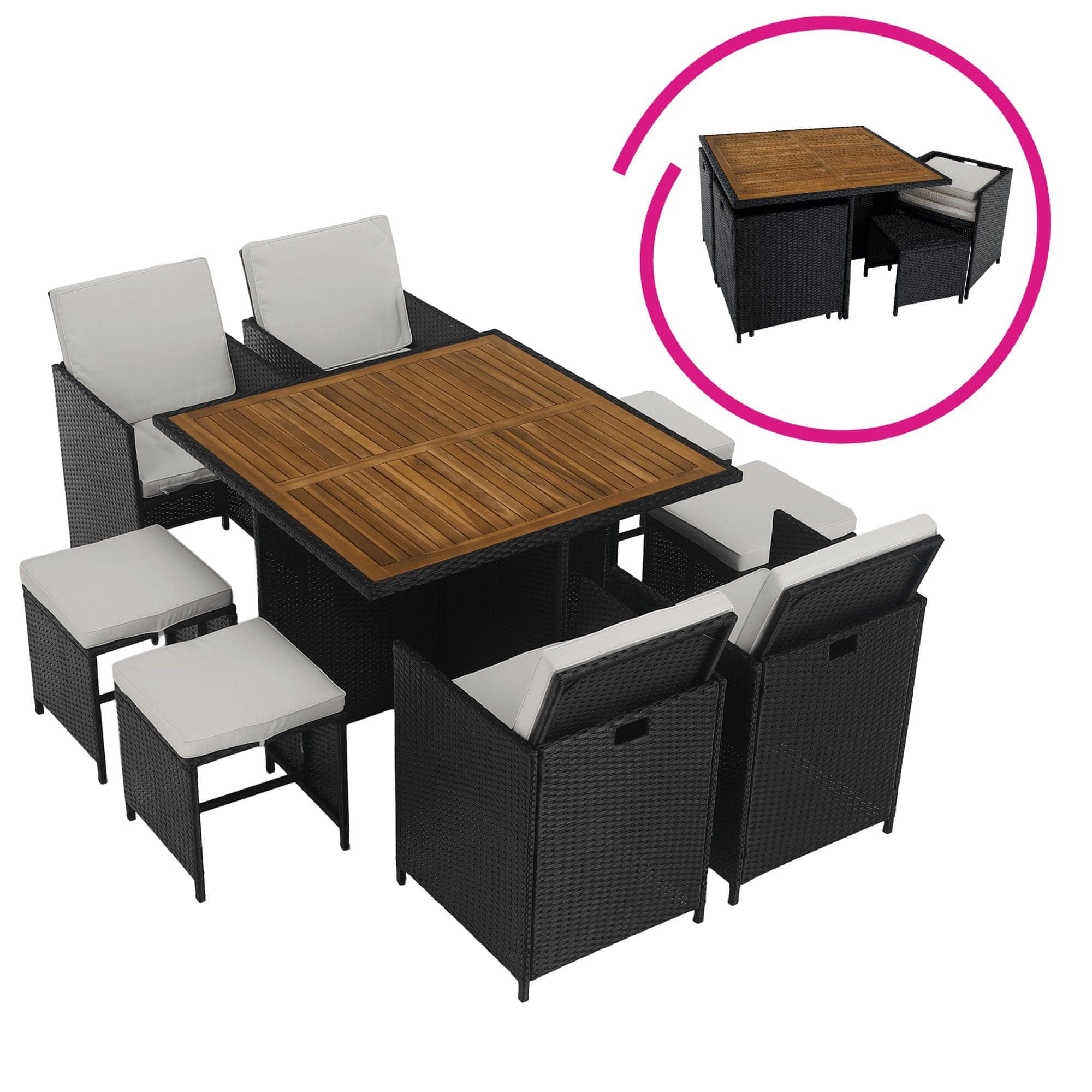 Zaljubite se v udobje vrtnega pohištva iz umetnega ratana MELFORD. Za izdelavo pohištva je bil uporabljen umetni ratan v kombinaciji z jeklom in masivnim akacijevim lesom. Sestavljen je iz štirih foteljev dimenzij (ŠxGxV): 53×58,7×86 cm, širina sedišča 48 cm, globina sedišča 40 cm in višina sedišča z blazino 50 cm in brez blazine 45 cm. Štirje tabureji dimenzij (ŠxGxV): 41×41×40 cm, višina sedišča z blazino je 45 cm in brez blazine 40 cm. Zahvaljujoč možnosti shranjevanja pod mizo lahko praktično prihranite veliko prostora. Miza z dimenzijami (ŠxGxV): 109×109×75 cm ima ploščo iz masivnega akacijevega lesa. Stoli in tabureji so opremljeni z blazinami debeline 5 cm. Njihova prevleka je vodoodporna in snemljiva ter jo lahko perete v pralnem stroju na 30°C. Maksimalna nosilnost na osebo je 90 kg. Dostavljen je razstavljen.