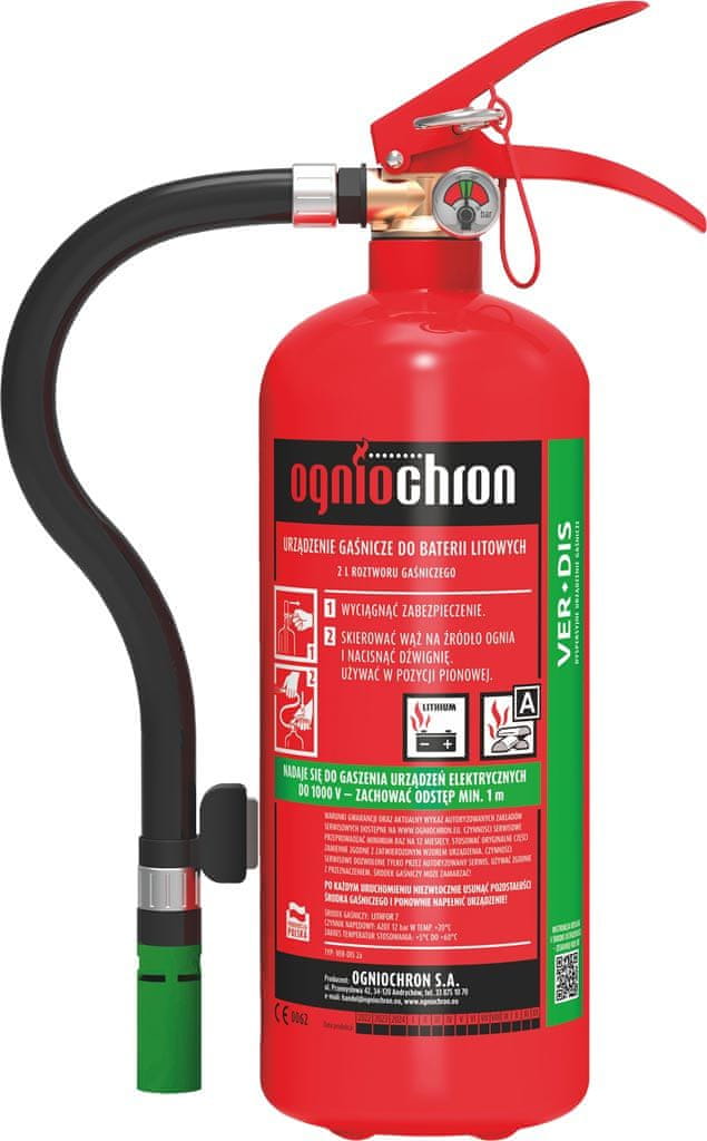 Gasilna naprava z vodo 2 kg. – namenjena za gašenje požarov skupine A – rezervoar za gasilni aparat prevlečen z UV-odporno poliestrsko barvo – enostavna in ergonomska uporaba – hitro in učinkovito gašenje – zaporni ventil za indikatorjem tlaka olajša upravljanje gasilnega aparata – čas delovanja min. 19 s – območje delovne temperature 5 °C + 60 °C – priporočljivo za gasilne naprave z litij-ionskimi baterijami, kot so prenosniki, tablice, prenosne baterije itd. (do 250 Wh) – primerna za uporabo na polnilnih postajah za vozila ali v skladiščih elektronske opreme – gasi tudi električne naprave pod napetostjo do 1000 V