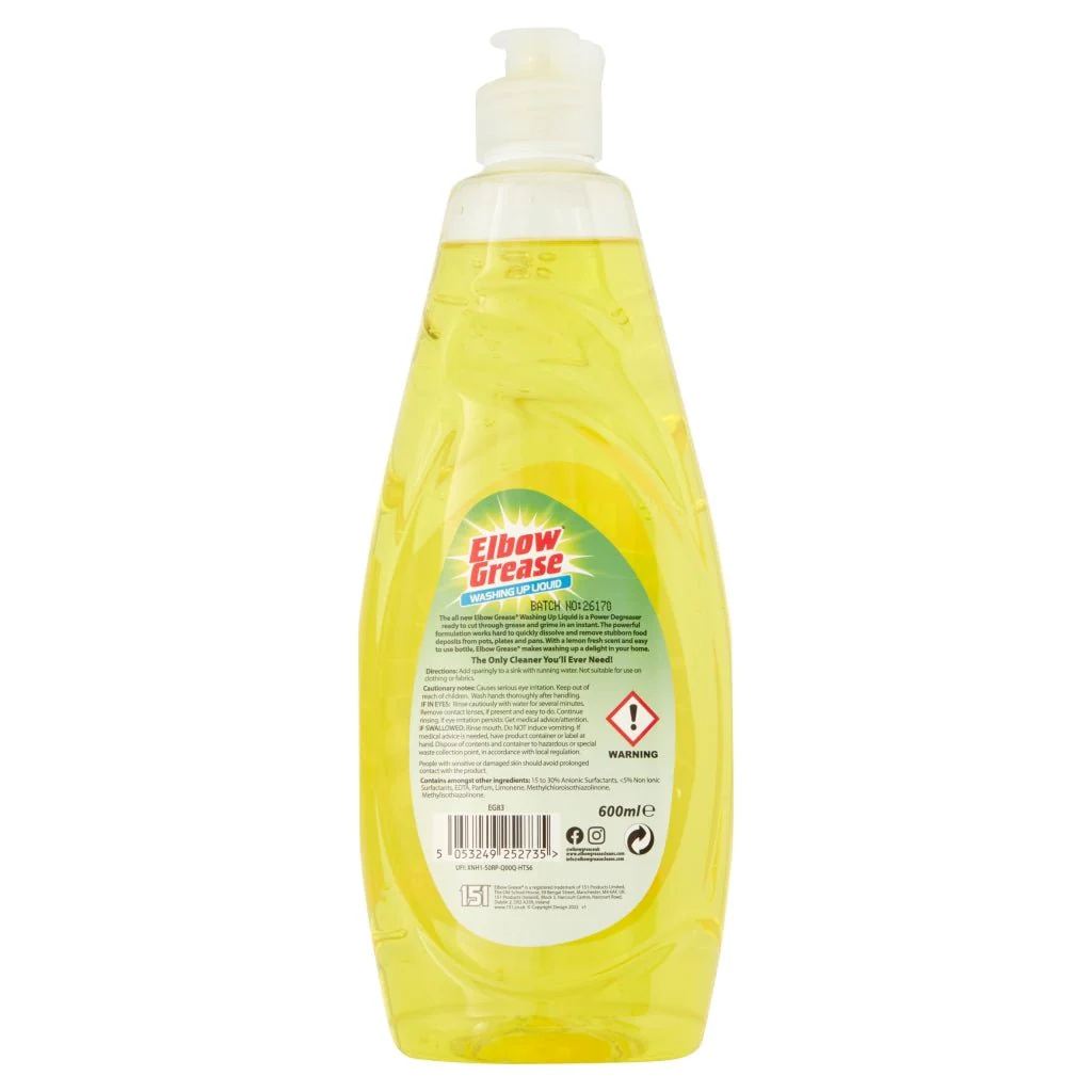 • Ekonomična embalaža: 600 ml embalaža zagotavlja dolgotrajno uporabo detergenta za pomivanje posode Elbow Grease, kar pomeni prihranek in udobje pri vsakodnevnih kuhinjskih opravilih.