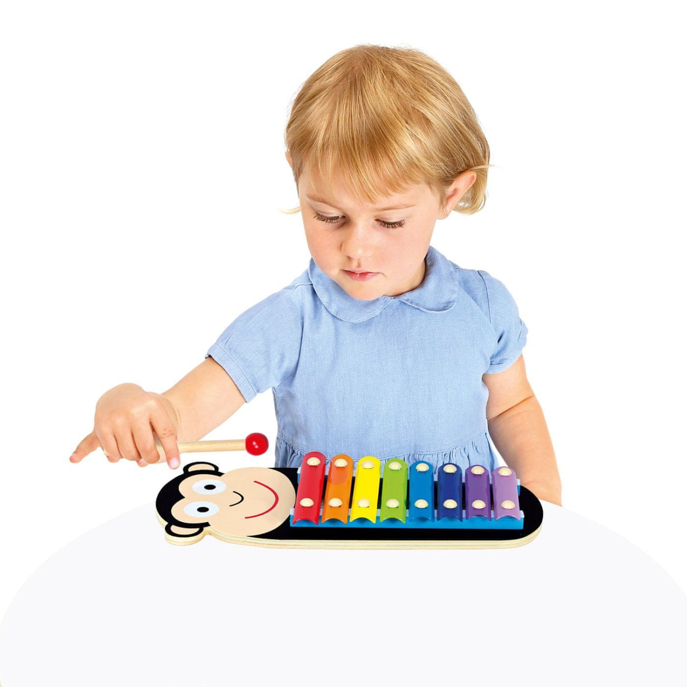 Detski ksilofon z motivom opice. 3-delni komplet z 8 kovinskimi zvočnimi ploščami, ki omogočajo igranje v polnem obsegu. Ksilofon ponuja otrokom priložnost, da se naučijo osnov glasbe in razvijajo svoje glasbene talente. Zato je idealna igrača za prve glasbene korake otrok.