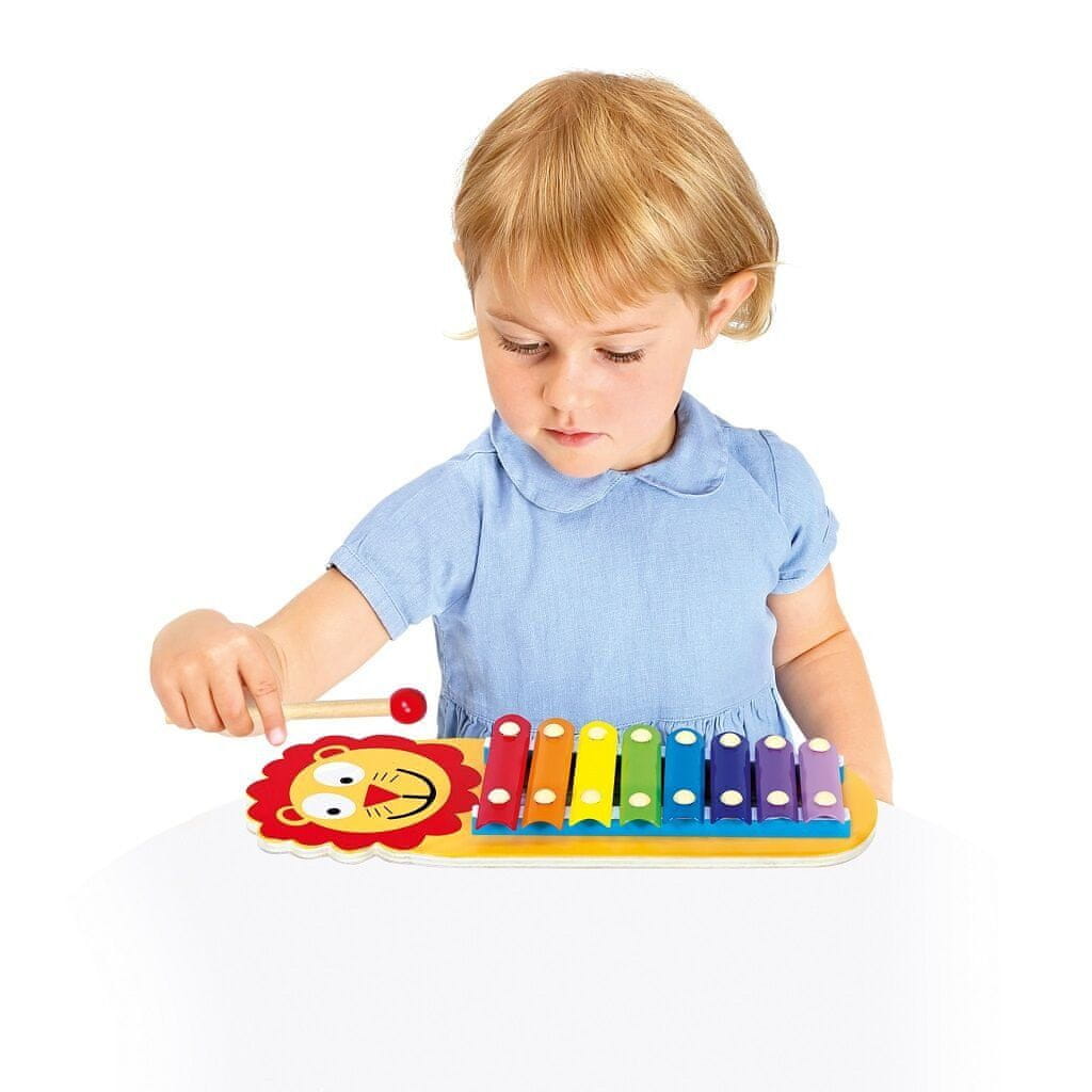 Detski ksilofon z motivom leva. Tridelni komplet z 8 kovinskimi zvočnimi ploščami, ki omogočajo igranje v celotnem obsegu. Ksilofon ponuja otrokom priložnost, da se naučijo osnov glasbe in razvijajo svoje glasbene talente. Zato je idealna igrača za prve glasbene korake otrok.