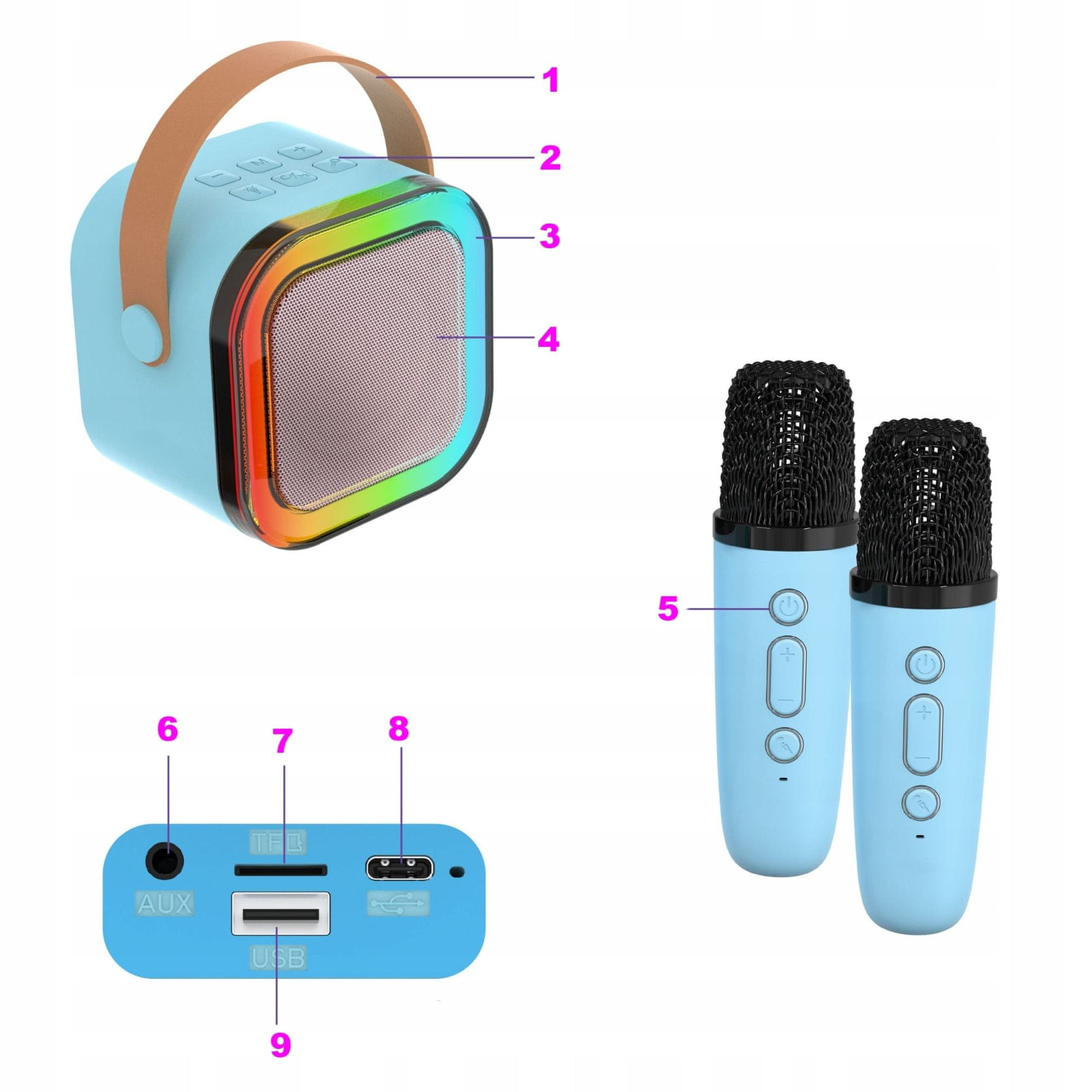 Dexxer Aku. 1200mAh karaoke zvočnik Bluetooth 5.3 2x mikrofon LED RGB moder