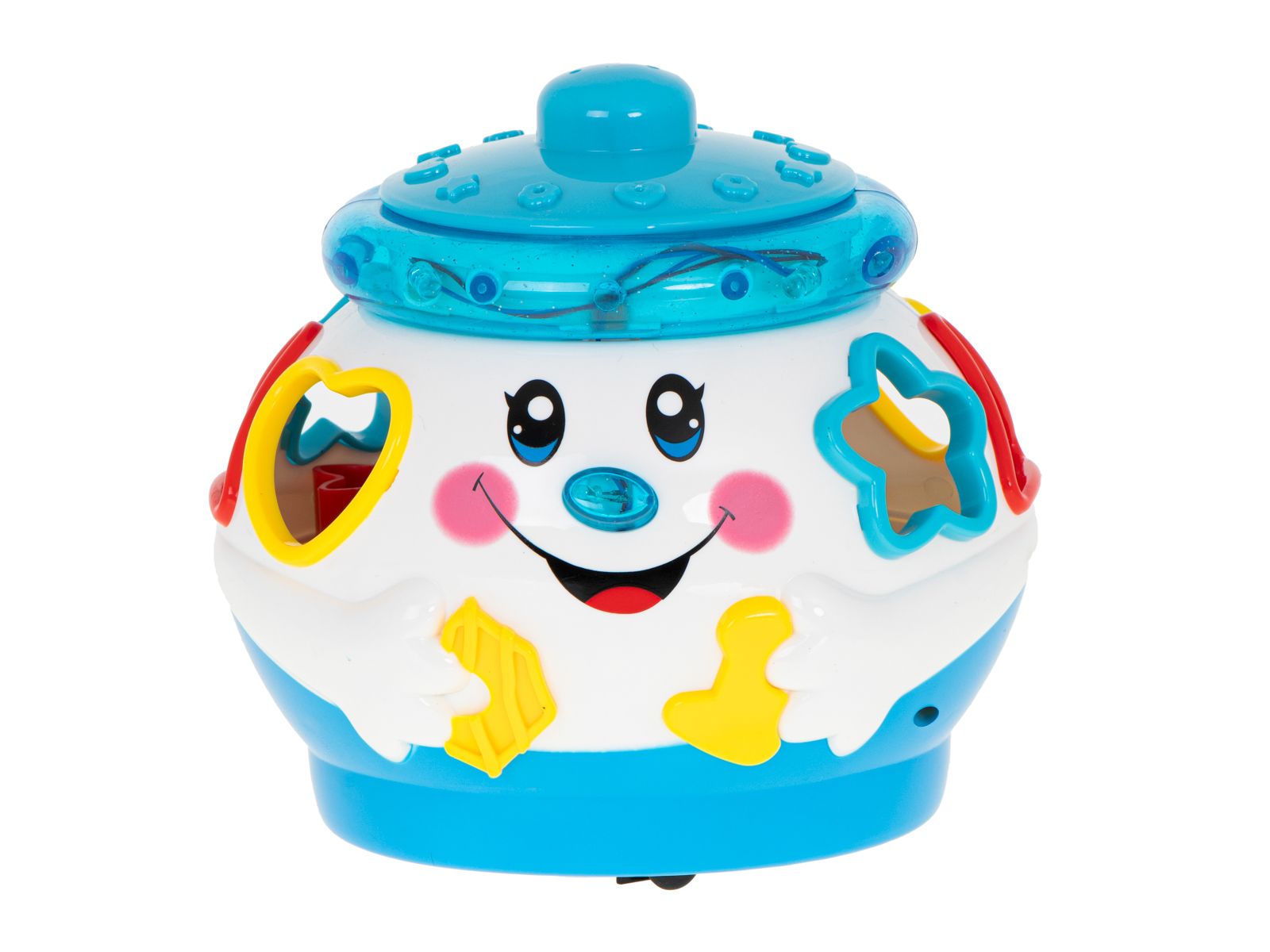 Ko je lonček vklopljen, igra melodije in se vozi po sobi. Komplet vsebuje 6 blokov različnih oblik, ki jih mora otrok vstaviti v ustrezne luknje. Napajanje: 3 baterije AA. Dimenzije: 12,5×10,5×14 cm.