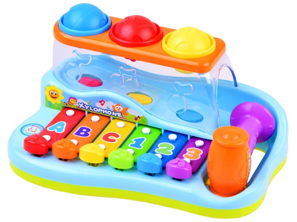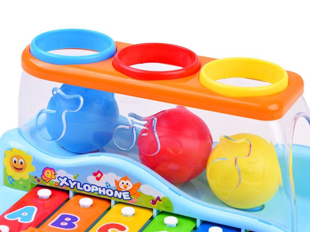 Deček lahko med igranjem udarja s kladivom po tipkah ali udarja kroglice skozi luknje – zvok iz cimbala se sliši med igro. Kroglice ob udarcu oddajajo dodatne note. Številke in črke so narisane na tipkah, kar otroku omogoča, da si zapomni vrstni red udarcev. Igrača ne potrebuje baterij.
