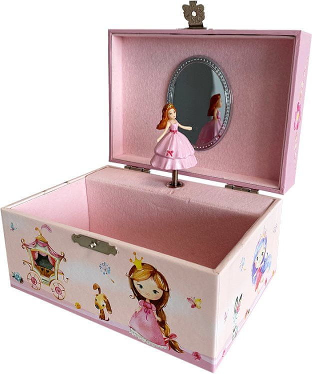 Polje se igra, ko ga odprete, in princesa se vrti pred svojim ogledalom. Izdelana je iz trdega trpežnega papirja. Glasbeno škatlo lahko uporabljate tudi kot škatlico za nakit za shranjevanje majhnih nakitnih predmetov.