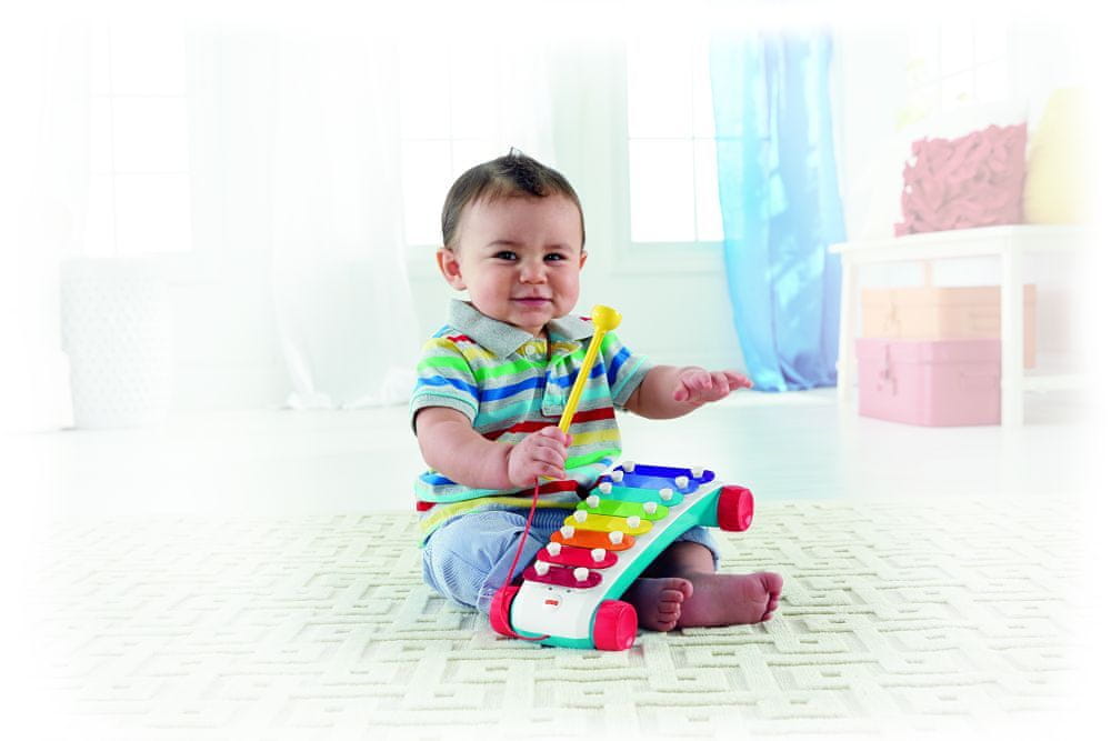 Klasični ksilofon podjetja Fisher-Price je v koraku s časom dobil popolnoma nov in eleganten videz. Otrok se bo ob njem vedno odlično zabaval! Zabaven izvlečni ksilofon z 8 pisanimi tipkami spodbuja otroke k glasbeni ustvarjalnosti. Malčkom pomaga razviti občutek za zmagoslavje. In ko se njihove glasbene spretnosti poglobijo, lahko s sledenjem barvam zaigrajo pravo pesem! Palica je trdno pritrjena, zato je ne boste nikoli izgubili. Ksilofon ima kolesa in vrvico za vlečenje, zato ga lahko otroci vzamejo s seboj kamor koli!