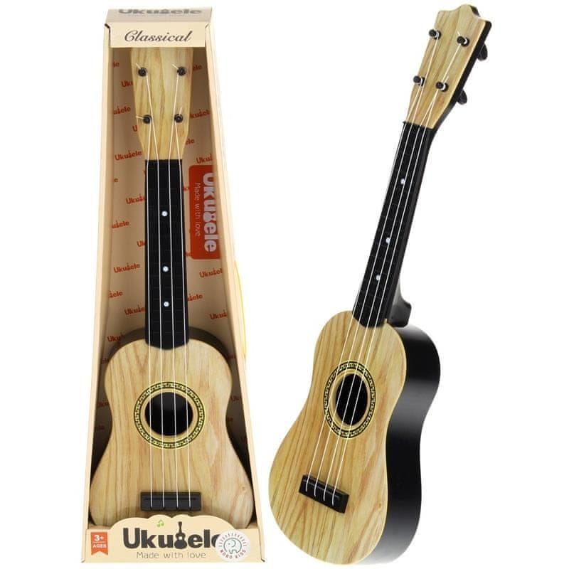 Ukulele kitara je idealna izbira za najmlajše glasbenike. Inštrument je izdelan iz plastike, ima 4 strune, ki jih je mogoče raztegniti, zaradi česar je zvočni učinek podoben zvokom prave kitare. Igrača podpira malčkovo domišljijo, koncentracijo in motorično koordinacijo. Skozi igro se otrok uči prepoznavanja zvokov. Strune lahko zamenjate s kovinskimi, ki jih kupite sami.