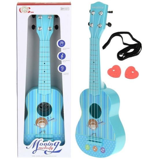 Ukulele kitara je idealna izbira za najmlajše glasbenike. Inštrument je narejen iz plastike in ima 4 strune, ki jih je mogoče raztegniti, zaradi česar je zvočni učinek podoben zvokom prave kitare. Igrača podpira malčkovo domišljijo, koncentracijo in motorično koordinacijo. Skozi igro se otrok uči prepoznavanja zvokov. Strune lahko zamenjate s kovinskimi, ki jih kupite sami.