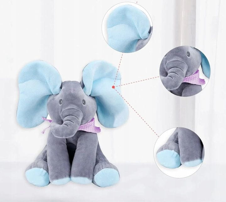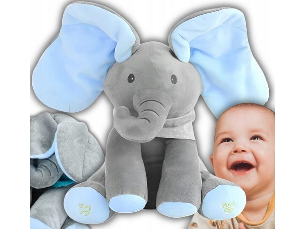 Interaktivna plišasta mehka plišasta igrača Peek-a-Boo slon, modra. Predstavljamo interaktivno plišasto igračo, ki jo lahko uporabite kot ljubkovca ali blazino za malčke. Iz varnega, mehkega in na dotik prijetnega materiala. Podarite svojemu otroku plišasto igračo, s katero bo preživel nepozabne trenutke igre. Prednosti: najboljši prijatelj vašega otroka. Prineslo bo veliko veselja in pozitivnih čustev. Mehak, na dotik prijeten material. Oblikovan za enostaven oprijem. Popolna plišasta igrača. Otroci se radi crkljajo s plišastimi živalmi. Sladka in prijetna mehkoba plišaste igrače ustvarja nepozaben občutek miru in tolažbe. Interaktivna igrača. Po pritisku na gumb PLAY se slonček pogovarja in igra skrivalnice z vašim otrokom ter si pri tem zamaši oči z ušesi. Zvoki in gibanje pritegnejo otrokovo pozornost. Po pritisku na gumb SING zapoje pesmi z miganjem z ušesi. ŠE DODATNO PO PRITISKU PLAY SLON PONAVLJA BESEDE, KI JIH IZGOVORIMO. Udobje in varnost: Plišasta igrača je izdelana iz mehkega, na dotik prijetnega in varnega materiala. Oblika blazine omogoča enostaven oprijem. Kot nalašč za najmlajše. Specifikacije: Igrača govori in poje v angleškem jeziku. Deluje na baterije: 3 × 1,5 V AA (ni priloženo). Material: pliš, bombaž. Barva: siva. Višina: pribl. 30 cm. Teža: pribl. 1 kg.