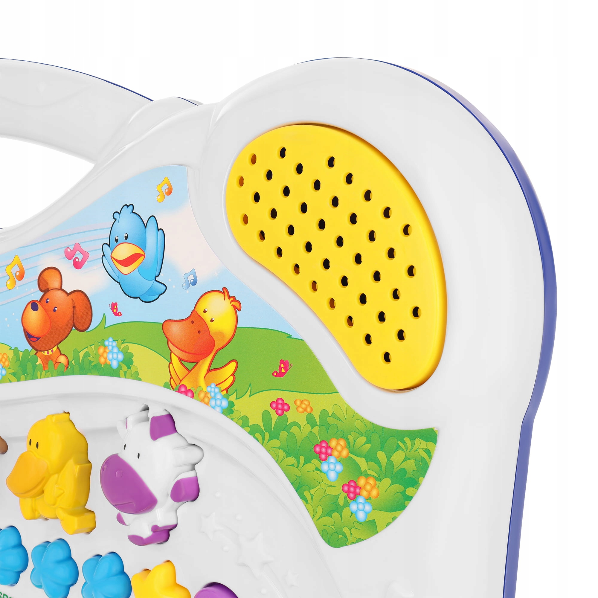 Na vrhu plošče igrače so gumbi v obliki živali, ki ob pritisku oddajajo otroške zvoke. To so konj, ovca, ptica, pes, raca in krava.