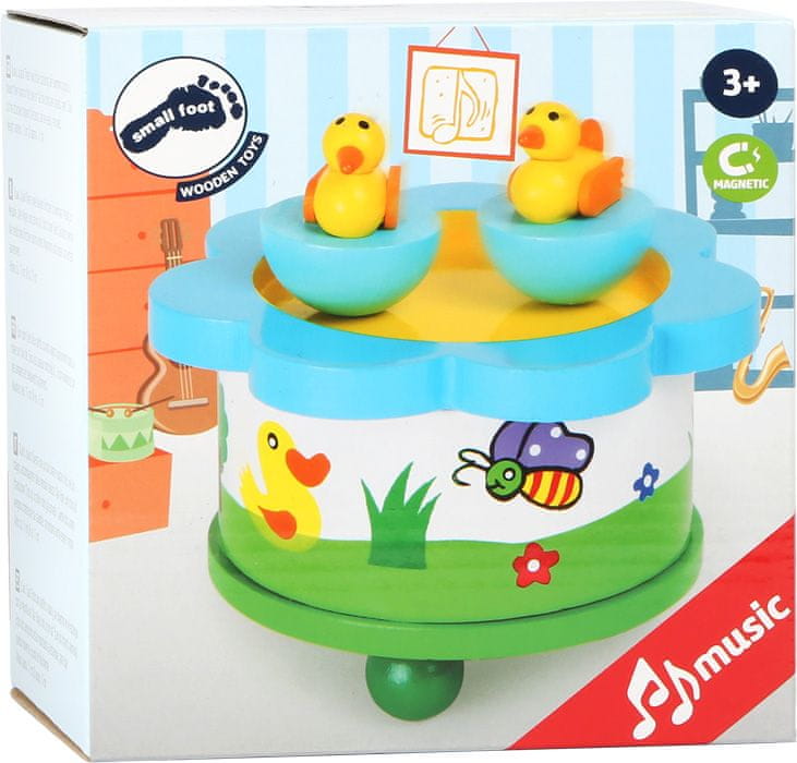 Kvak, kvak! Dve majhni rački z veseljem razžarita otroške oči, ko plešeta okoli ribnika ob spevni melodiji. Rackici sta z magneti varno pritrjeni na vrhu lesene izvlečne glasbene skrinjice. Z lahkoto jih je mogoče odstraniti in otroci se lahko z njimi igrajo na tleh ali na mizi. Zaradi enostavnega upravljanja lahko tudiotrocisamostojno upravljajo to igralno škatlo.Glavneznačilnosti: enostaven za uporaboPodpira domišljijo