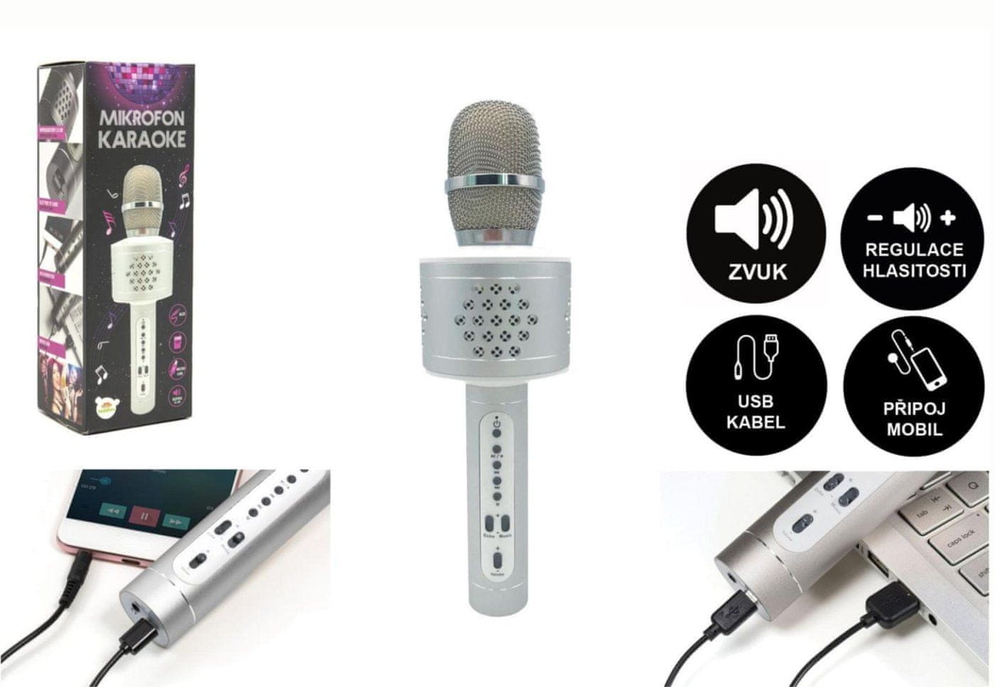 - čas delovanja pri 50-odstotni glasnosti je 14 ur, pri 100-odstotni glasnosti pa 9 ur. Vsebina paketa: mikrofon za karaoke, polnilni kabel USB do Micro USB, zvočni kabel, navodila za uporabo. Barva: srebrna. Želimo vam veliko zabave! Dimenzije paketa: 10 × 28 × 9 cm. Ni igrača.