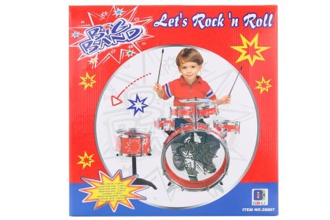 Komplet bobnov. Vključuje 1 bas boben, 1 majhen tom tom, 1 velik tom tom, 3 mini tom tom tom, 1 činele, 1 pedalni mehanizem, 2 bobnarski palici in 1 stol. Dimenzije paketa 39,5 × 17 × 40 cm. Od 3. leta starosti.