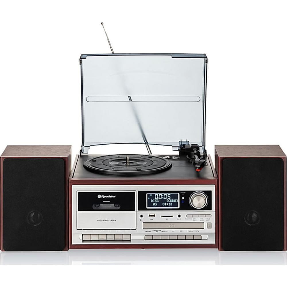 Bluetooth DAB+ in FM radio Predvajalnik CD – predvaja MP3, CD, CD-R, RW Moč 2×4W RMS, 64W PMPO Prednastavljen izenačevalnik (rock, pop, Calssic, Jazz) Možnost snemanja prek USB Vhodi: USB, AUX RCA, kartica SD Izhodi: slušalke, RCA Predvajalnik kaset, avtostop LCD zaslon, modra osvetlitev