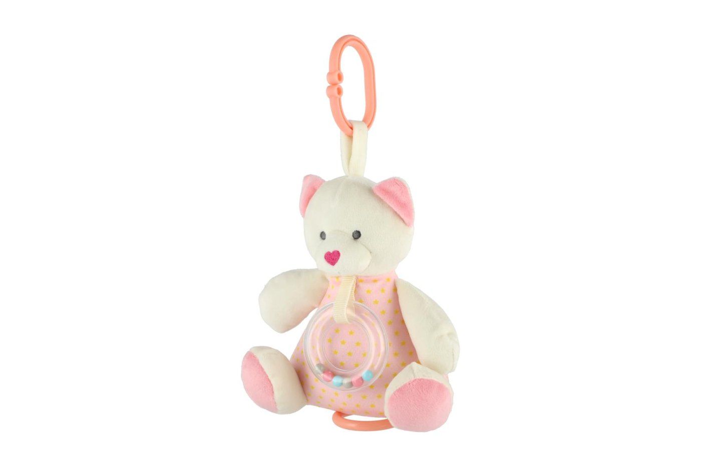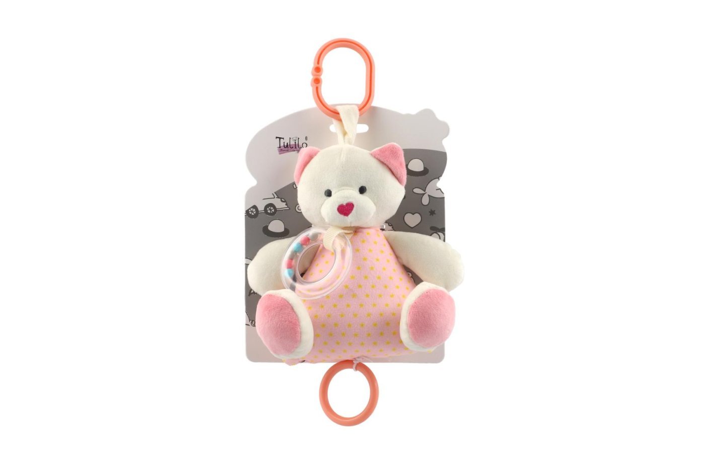 Razkošni rožnati navijalni medvedek predvaja prijetno melodijo, ki otroka pomiri pri spanju. Igračo lahko s sponko obesite na otroško posteljico ali voziček. Igralni strojček je vgrajen v medvedka Velikost igrače: 18 cm Primerno za otroke od rojstva dalje