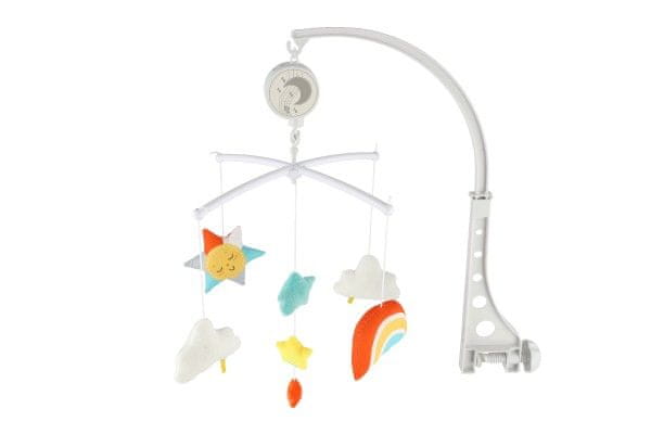 Kolesar nad posteljico s plišastimi pisanimi igračami bo otroka zabaval in mu pomagal zaspati. Na vsaki od štirih plastičnih rok boste našli mavrico, sonce, oblake in zvezde. Vrtiljak igra prijetno melodijo – ima stojalo za navijanje. Dimenzije škatle: 19 × 33 × 5,5 cm Primerno od 6. meseca