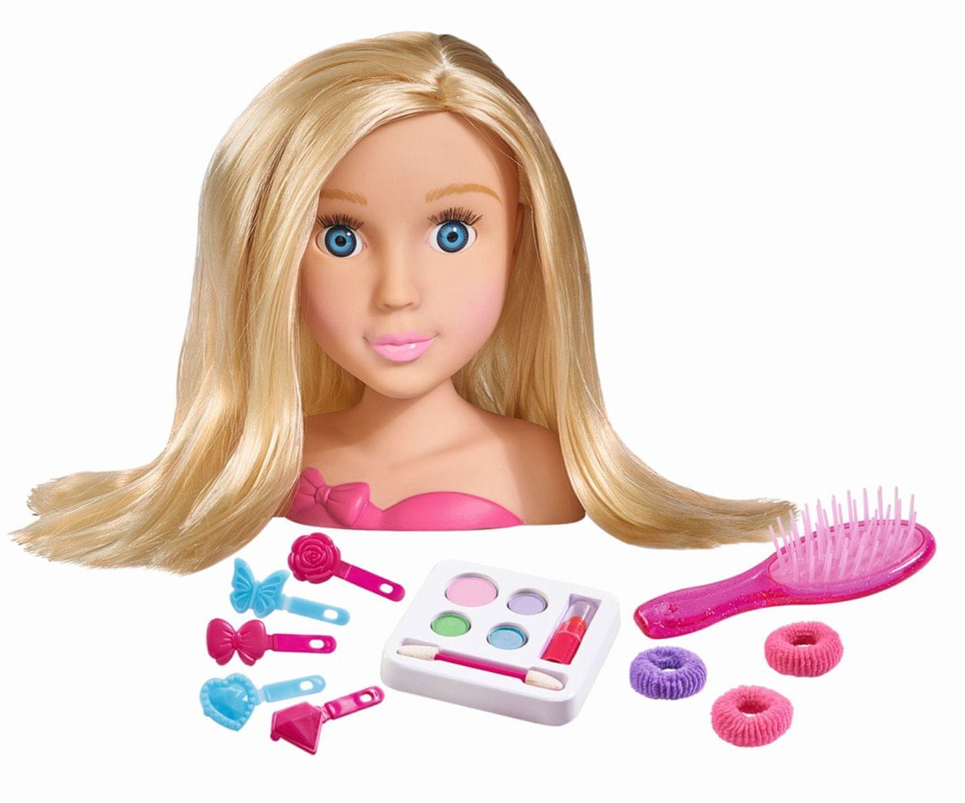 Kadrirnica za preizkušanje modnih pričesk in ličenja. Vključeni so lasje in lepotni dodatki. Vključuje skupaj 16 kosov. Višina glave 19 cm.