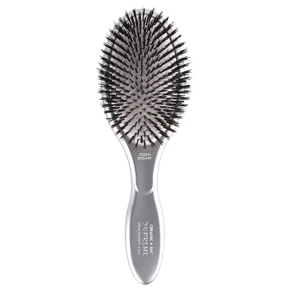 Supreme 100% Boar Ceramic+Ion je profesionalna krtača za ravnanje in oblikovanje las znamke Olivia Garden. Čopič je bil izdelan z največjo pozornostjo do detajlov iz visokokakovostnih materialov. Njegova ionizirana glava je sestavljena iz mehke blazine in keramične prevleke. Nedrseč, funkcionalen ročaj olajša oblikovanje. Ščetine, uporabljene v Supreme 100% Boar Ceramic+Ion, so 100% naravne ščetine merjasca. Zgladi dlako in ji doda sijaj