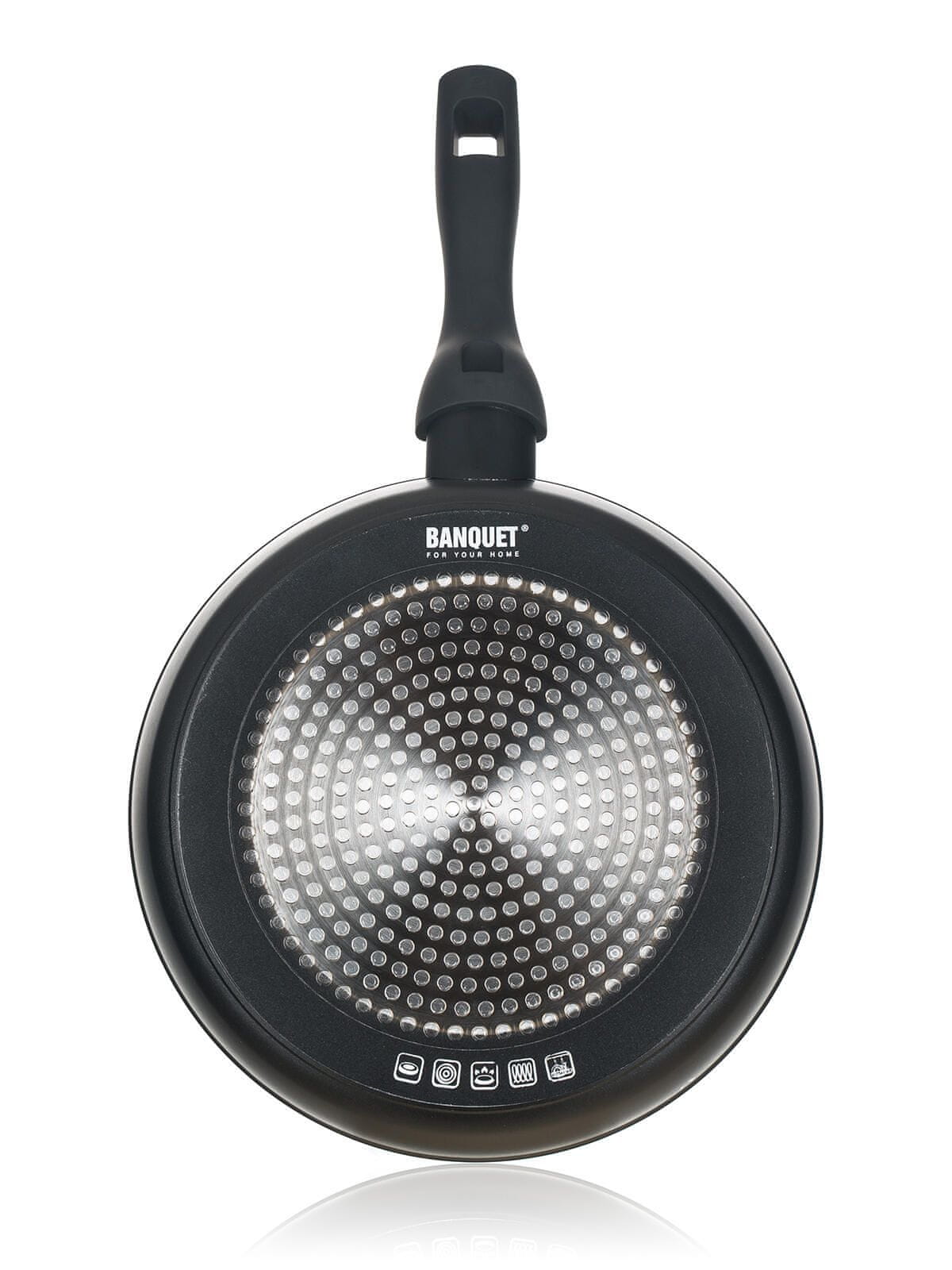 Aluminijasta kovana ponev GRAZIA s 3-slojno neprijemljivo površino blagovne znamke ILAG PREMIUM. GRAZIA PREM PREMIUM z dvoslojnim ognjevarnim premazom na zunanji strani. Indukcijsko dno z laserskim tiskom piktogramov.