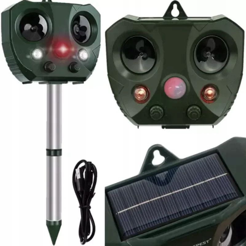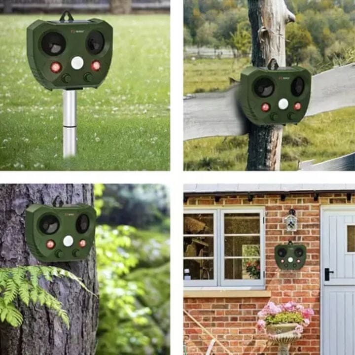 Zvočniki so prilagojeni za oddajanje za živali neprijetnih ultrazvočnih valov. Poleg tega je naprava opremljena z LED diodami, ki dajejo bel in rdeč svetlobni signal. Naprava ima tudi senzor gibanja z dometom do 10 metrov, ki aktivira odganjalec, ko zazna gibanje znotraj dosega senzorja, zaradi česar je energetsko učinkovit. Odganjalec deluje tudi ponoči. Kot delovanja naprave je okoli 110 stopinj, zahvaljujoč čemur je zelo občutljiv. Odganjalec ima luknjo za obešalo in konico za zabadanje v tla. Tako ga lahko obesite na drevo, ograjo, pritrdite na steno ali pa ga kar zapičite v zemljo. Napajanje je možno preko solarnega panela, ali preko vhoda USB. Odganjalec samo zapičite v tla ali ga namestite na drugo sončno mesto. Tako bo naprava neprekinjeno delovala ves čas. V neugodnem vremenu lahko odganjalec napolnite iz električnega omrežja s pomočjo priloženega USB kabla za polnjenje.