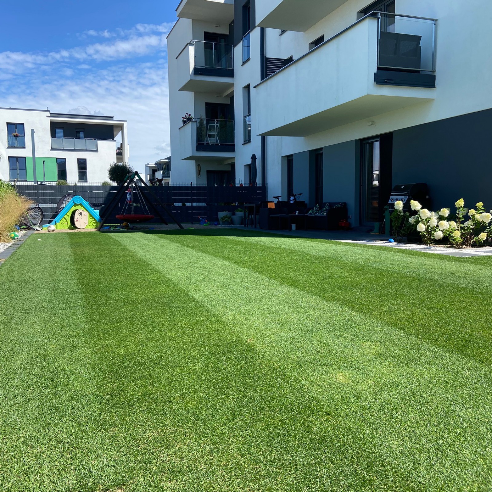 ? Izjemna vzdržljivost: Trata, odporna na intenzivno uporabo, teptanje in spreminjajoče se vremenske razmere, vključno s sušo, zmrzaljo in močno sončno svetlobo.