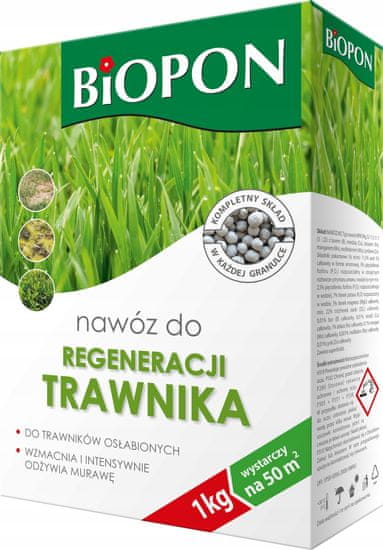 Biopon 1kg granulirano gnojilo za regeneracijo trate BIOPON 1kg priskoči na pomoč, ko je vaša trata oslabljena in potrebuje hitro zunanjo podporo. Zaradi visoke vsebnosti dušika to regenerativno gnojilo Bros. spodbuja rast trave, kar z ustrezno pogostostjo košnje okrepi končni učinek. Trata postane močnejša in vizualno impresivna. Učinki gnojila Biopon so presenetljivo hitri. Izdelek je sestavljen iz naslednjih elementov: 7 % dušika, 5 % fosforja, 8 % kalija, 4,5 % magnezija, 20 % žvepla in 4,5 % železa. Ta kombinacija makrohranil zagotavlja odlične rezultate. Parametri: Blagovna znamka: Biopon Uporaba: Gnojilo za regeneracijo trate Embalaža: Škatla Pokritost: 50 m² Teža: 1 kg