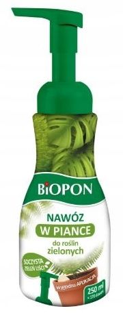 Gnojilo za zelene rastline proizvajalca Biopon je mineralno gnojilo v obliki pene, namenjeno gnojenju vseh okrasnih zelenih rastlin. Popolnoma izbrana sestava pripravka poskrbi, da rastline izgledajo lepo in so v odličnem stanju. Mineralne sestavine v gnojilu prispevajo k intenzivni rasti rastlin in bujnim zelenim listom. Zaradi konsistence pene se gnojilo zlahka absorbira v rastline in je priročno za uporabo. Nanaša se neposredno v lonček, brez potrebe po merjenju pravilnega odmerka.