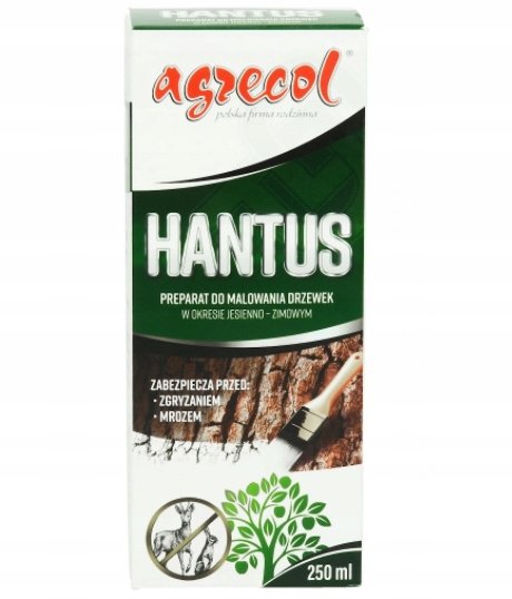 Barva za drevesa 250 ml Agrecol barva za drevesa ščiti drevesna debla in poganjke pred odtajanjem jeseni in pozimi. Ščiti drevesa pred pašo divjih živali. Zaradi svoje bele barve Hantus odbija sončno sevanje – drevesna debla se ne segrejejo, kar preprečuje njihovo odtajanje med zimskim mirovanjem. Izdelek ščiti drevesa tudi pred poškodbami in razpokami, ki jih povzroči zmrzal. Bela barva izdelka preprečuje, da bi divje živali pokazale zanimanje za pobarvane rastline. Izdelek se lahko uporablja tudi na mladih iglavcih, kar omogoča uporabo pri gojenju okrasnih rastlin in v gozdnih drevesnicah. Parametri: Blagovna znamka: Agrecol Uporaba: Zaščita pred pašo in zmrzaljo Embalaža: steklenica Prostornina: 250 ml Navodila za uporabo: Izdelek uporabljajte v zimski sezoni (od novembra do aprila), ko so rastline v zimskem mirovanju. Pred uporabo steklenico močno pretresite. Uporabljajte pri temperaturah nad 0˚C. Izdelka ne nanašajte med dežjem. Ko se izdelek posuši, zdrži do 3 mesece. Prva metoda – ročno: Nadenite si gumijaste rokavice. Na roko nalijte majhno količino izdelka. Izdelek nanesite na poganjek od spodaj navzgor, da ne poškodujete popkov. Drugi način – uporaba čopiča: Čopič namočite v izdelek. Razporedite ga po površini debel in poganjkov. Pri uporabi izdelka na iglavcih pokrijte le rast tekočega leta. Izdelek nanašajte pozimi (od novembra do aprila), ko so rastline v mirovanju. Pred uporabo stekleničko močno pretresite. Uporabljajte pri temperaturah nad 0 °C. Izdelka ne nanašajte med dežjem. Ko se izdelek posuši, zdrži do 3 mesece.