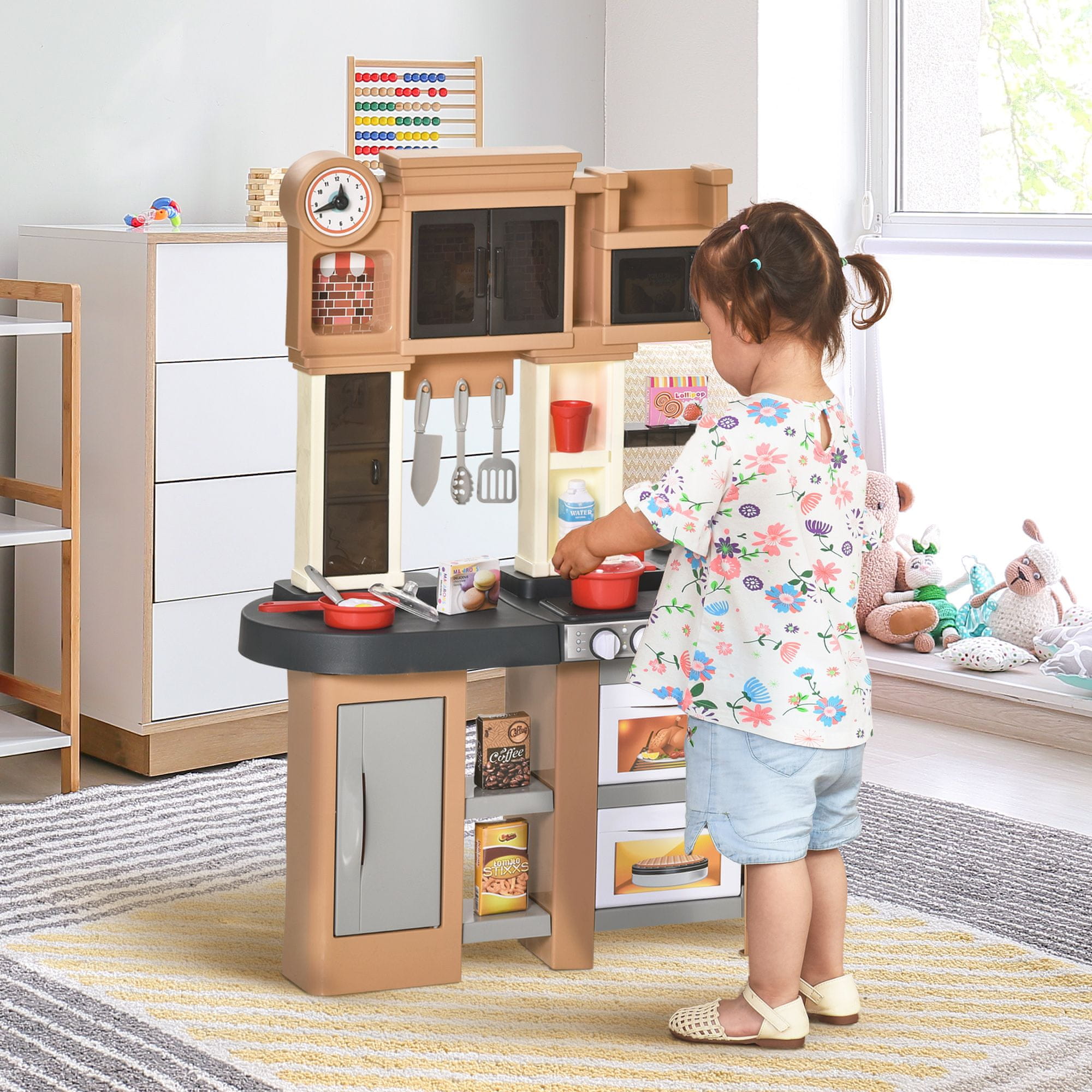 HOMCOM Otroška kuhinja 3- 6 let z 58 dodatki, štedilnik z zvoki in delujočim umivalnikom, 63x35x84, siva Rjava